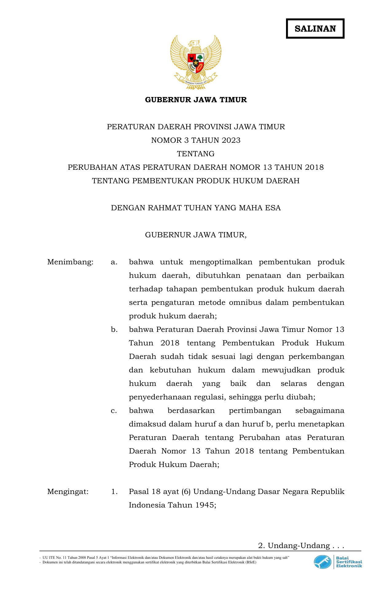 PERDA Nomor 3 Tahun 2023 | Peraturan Daerah Nomor 3 Tahun 2023 tentang PERUBAHAN ATAS PERATURAN DAERAH NOMOR 13 TAHUN 2018TENTANG PEMBENTUKAN PRODUK HUKUM DAERAH