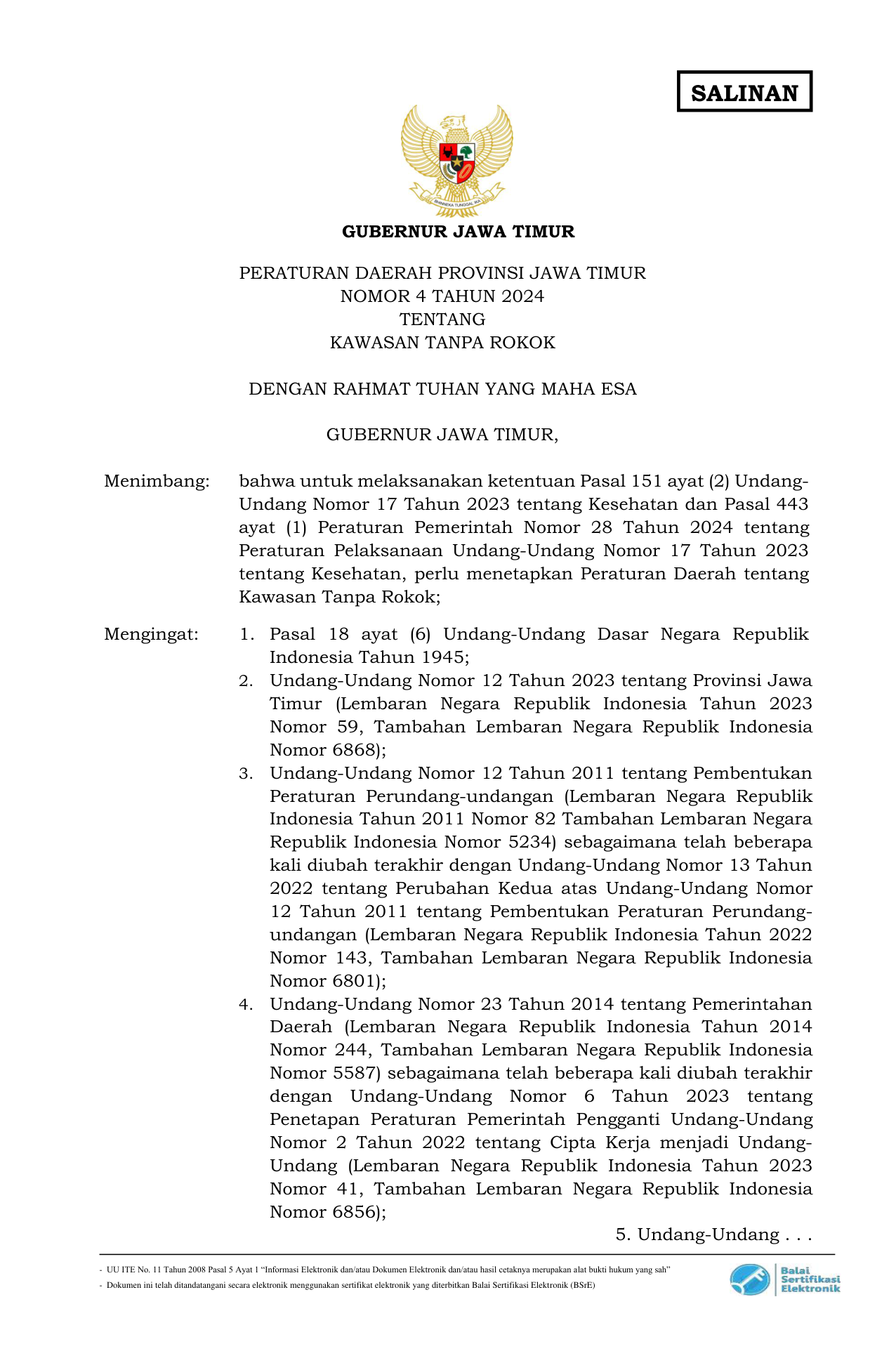 PERDA Nomor 4 Tahun 2024 | Peraturan Daerah Nomor 4 Tahun 2024 tentang Kawasan Tanpa Rokok