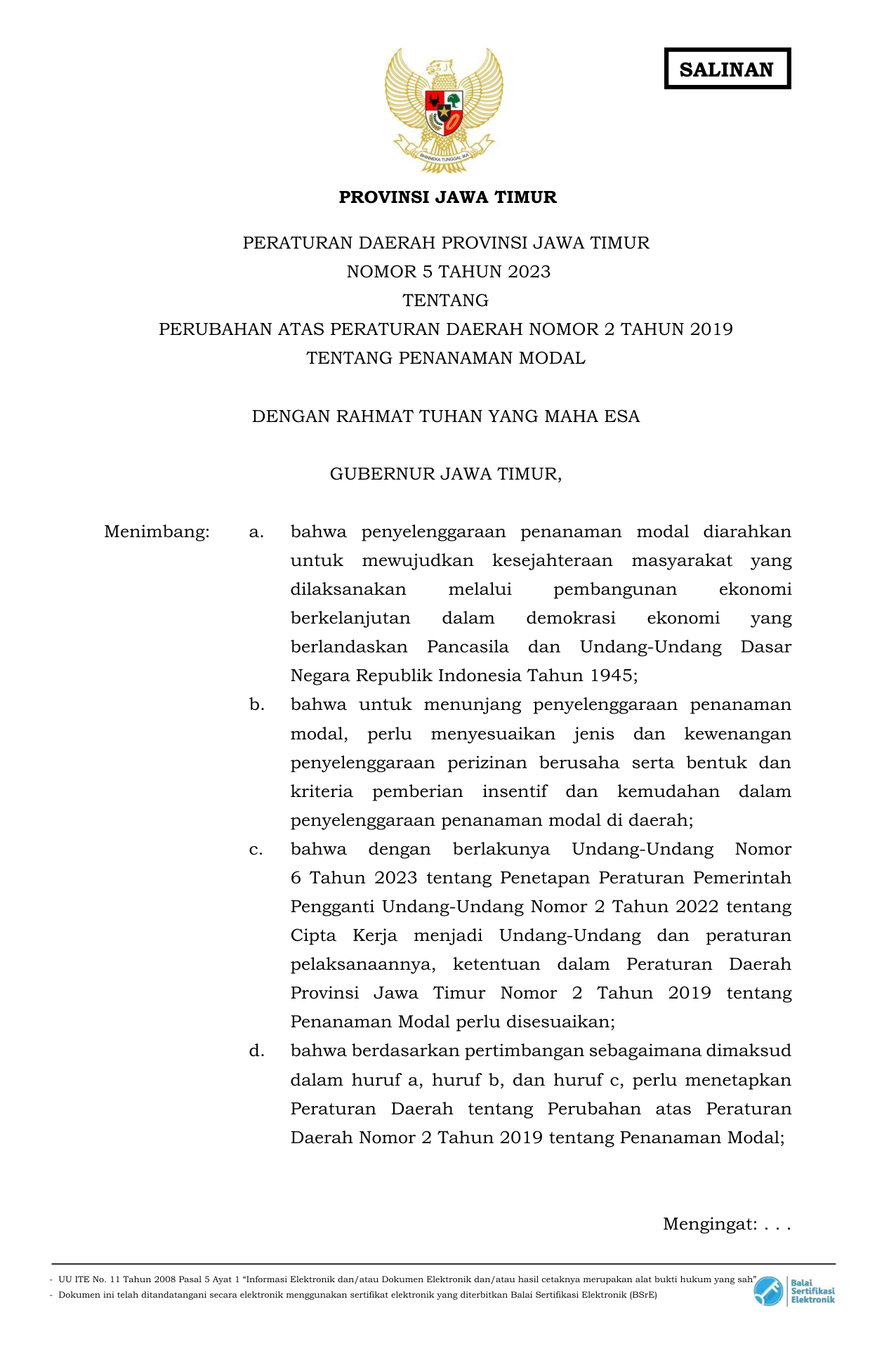 PERDA Nomor 5 Tahun 2023 | Peraturan Daerah Nomor 5 Tahun 2023 tentang Perubahan Atas Peraturan Daerah Nomor 2 Tahun 2019 Tentang Penanaman Modal