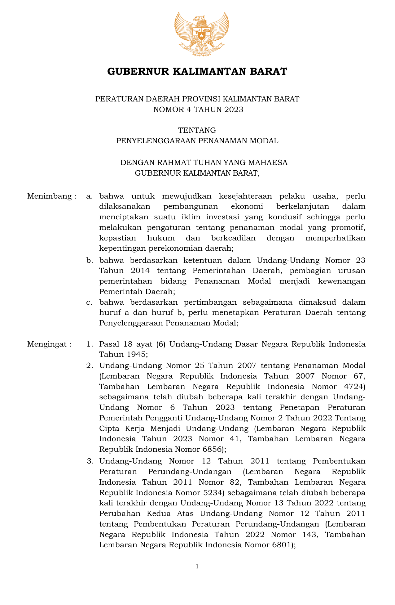PERDA Nomor 4 Tahun 2023 | Peraturan Daerah Nomor 4 Tahun 2023 tentang PENYELENGGARAAN PENANAMAN MODAL