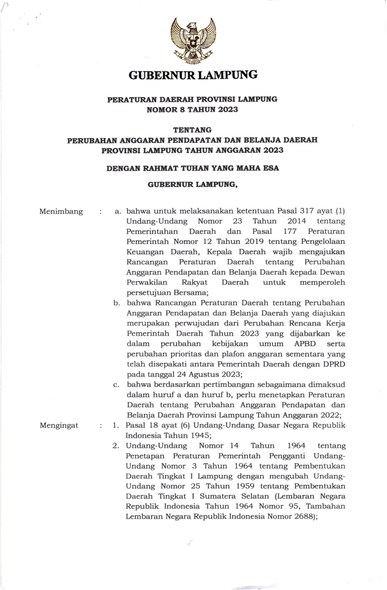 PERDA Nomor 8 Tahun 2023 | Peraturan Daerah Nomor 8 Tahun 2023 tentang Perubahan Anggaran Pendapatan Dan Belanja Daerah Provinsi Lampung Tahun Anggaran 2023