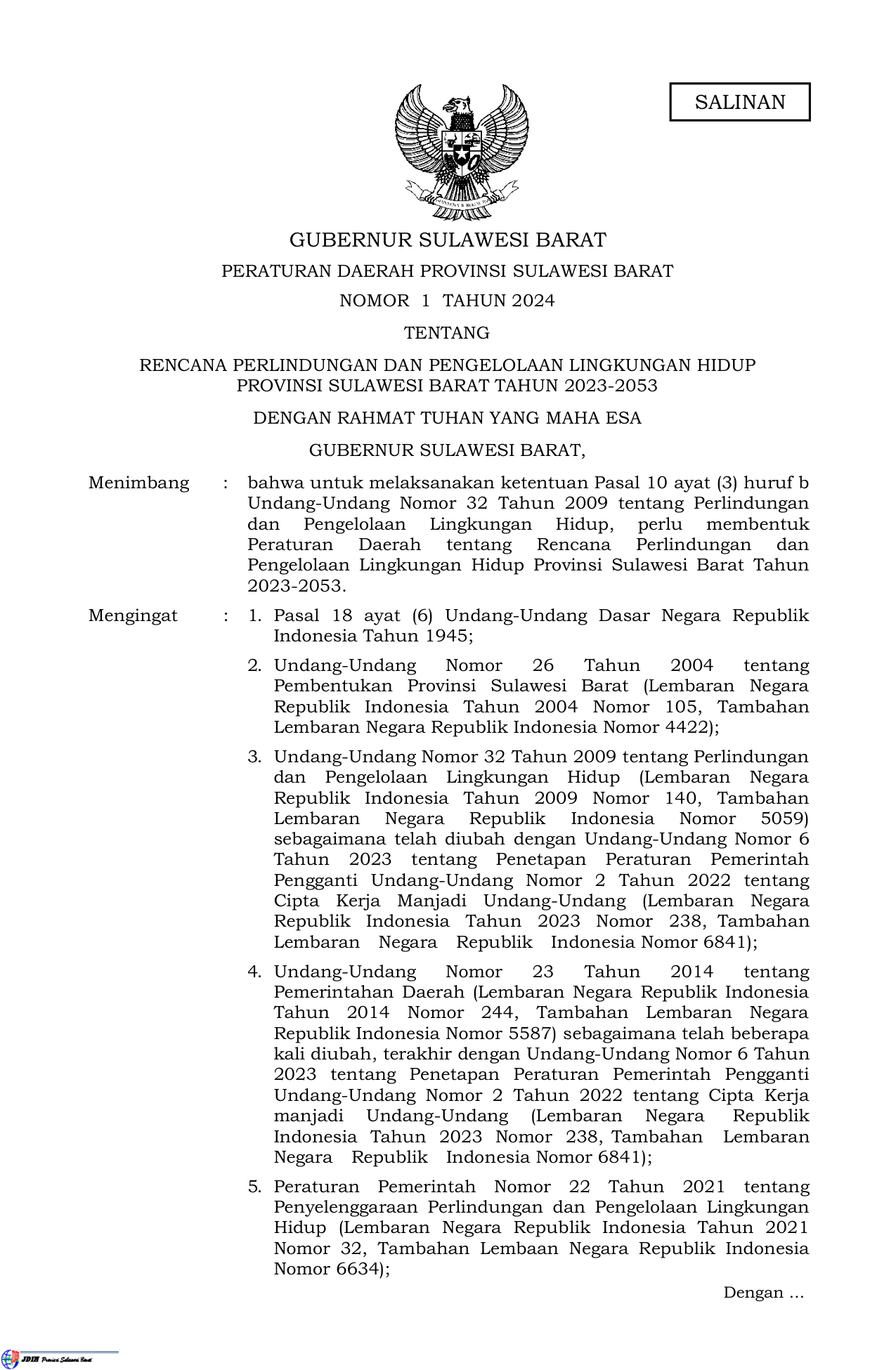 PERDA Nomor 1 Tahun 2024 | Peraturan Daerah Nomor 1 Tahun 2024 tentang RENCANA PERLINDUNGAN DAN PENGELOLAAN LINGKUNGAN HIDUP PROVINSI SULAWESI BARAT TAHUN 2023-2053