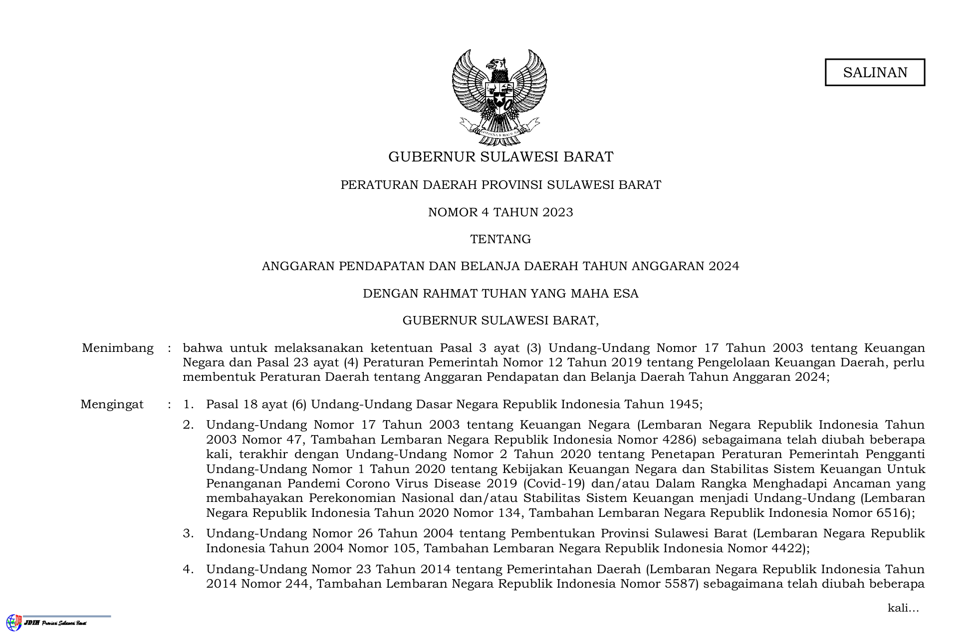 PERDA Nomor 4 Tahun 2023 | Peraturan Daerah Nomor 4 Tahun 2023 tentang ANGGARAN PENDAPATAN DAN BELANJA DAERAH TAHUN ANGGARAN 2024