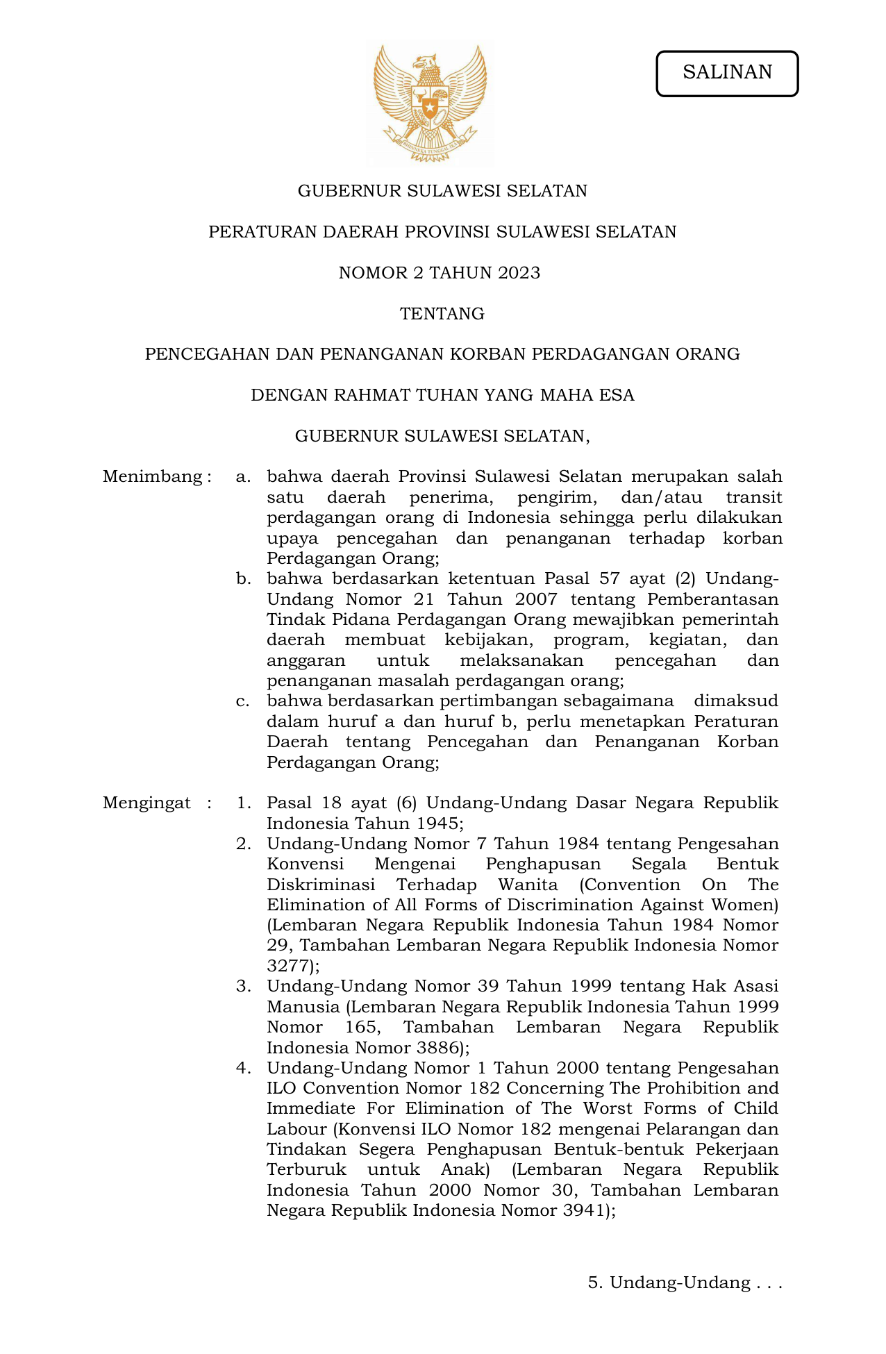 PERDA Nomor 2 Tahun 2023 | Peraturan Daerah Nomor 2 Tahun 2023 tentang Pencegahan dan Penanganan Korban Perdagangan Orang