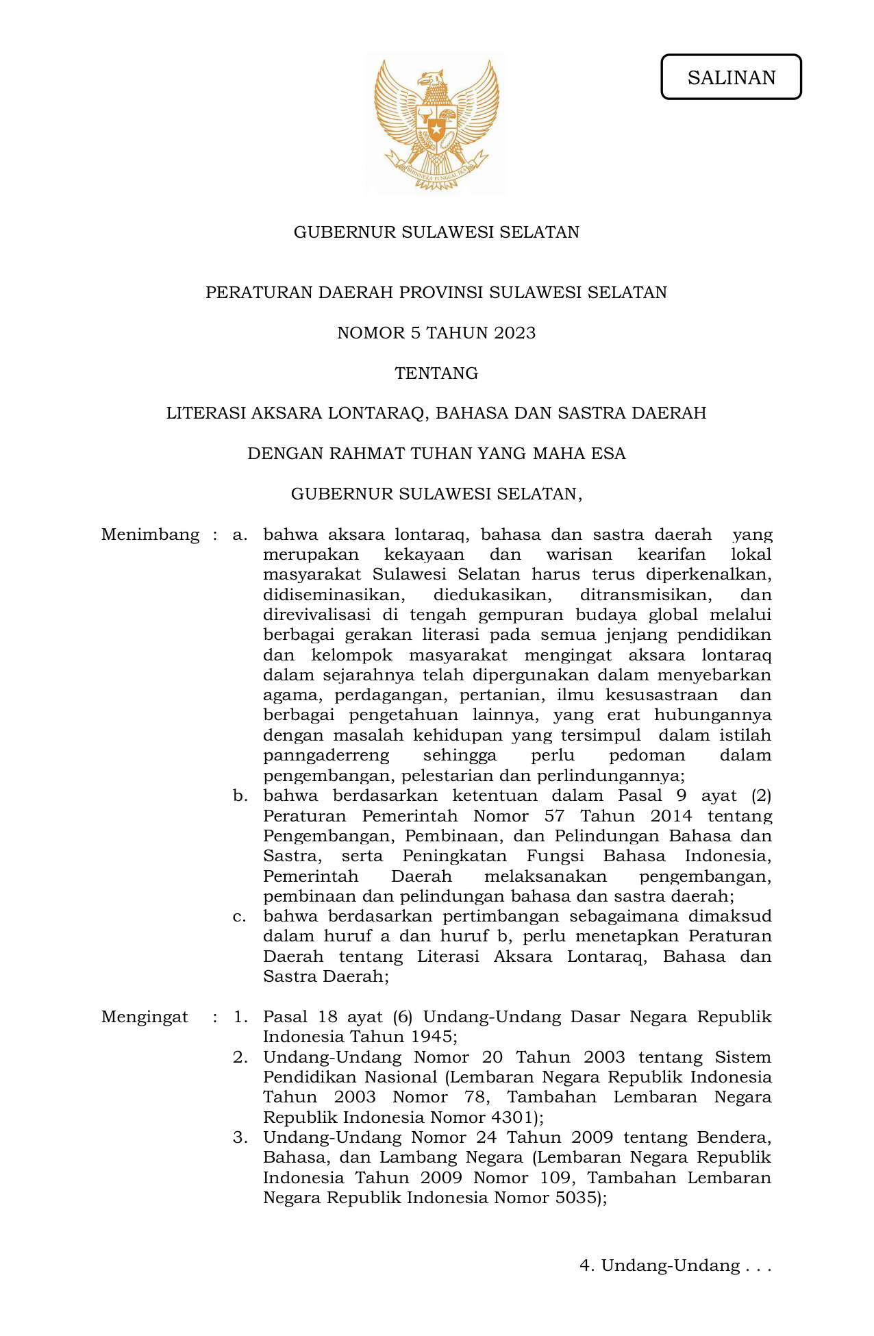 PERDA Nomor 5 Tahun 2023 | Peraturan Daerah Nomor 5 Tahun 2023 tentang LITERASI AKSARA LONTARAQ, BAHASA DAN SASTRA DAERAH