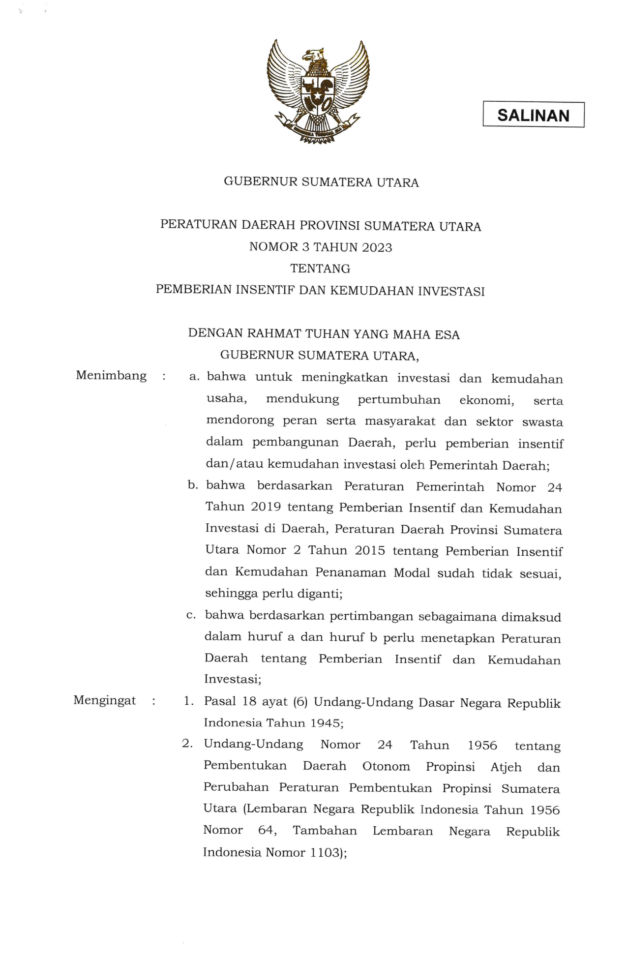 PERDA Nomor 3 Tahun 2023 | Peraturan Daerah Nomor 3 Tahun 2023 tentang Peraturan Daerah Sumatera Utara Nomor 3 Tahun 2023 tentang Pemberian Insentif dan Kemudahan Investasi