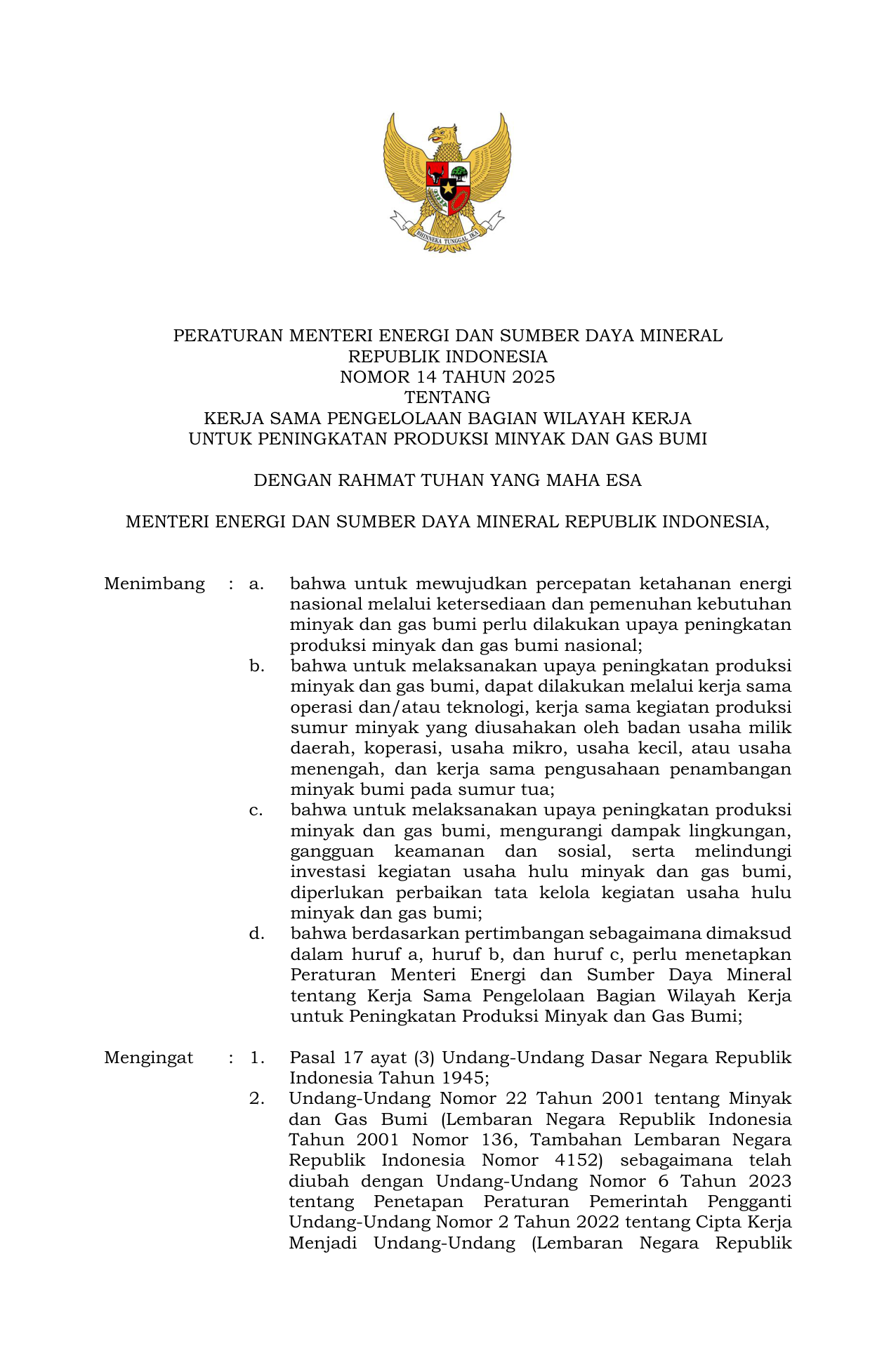 PERMEN Nomor 14 Tahun 2025 | Peraturan Menteri Nomor 14 Tahun 2025 tentang Kerja Sama Pengelolaan Bagian Wilayah Kerja untuk Peningkatan Produksi Minyak dan Gas Bumi