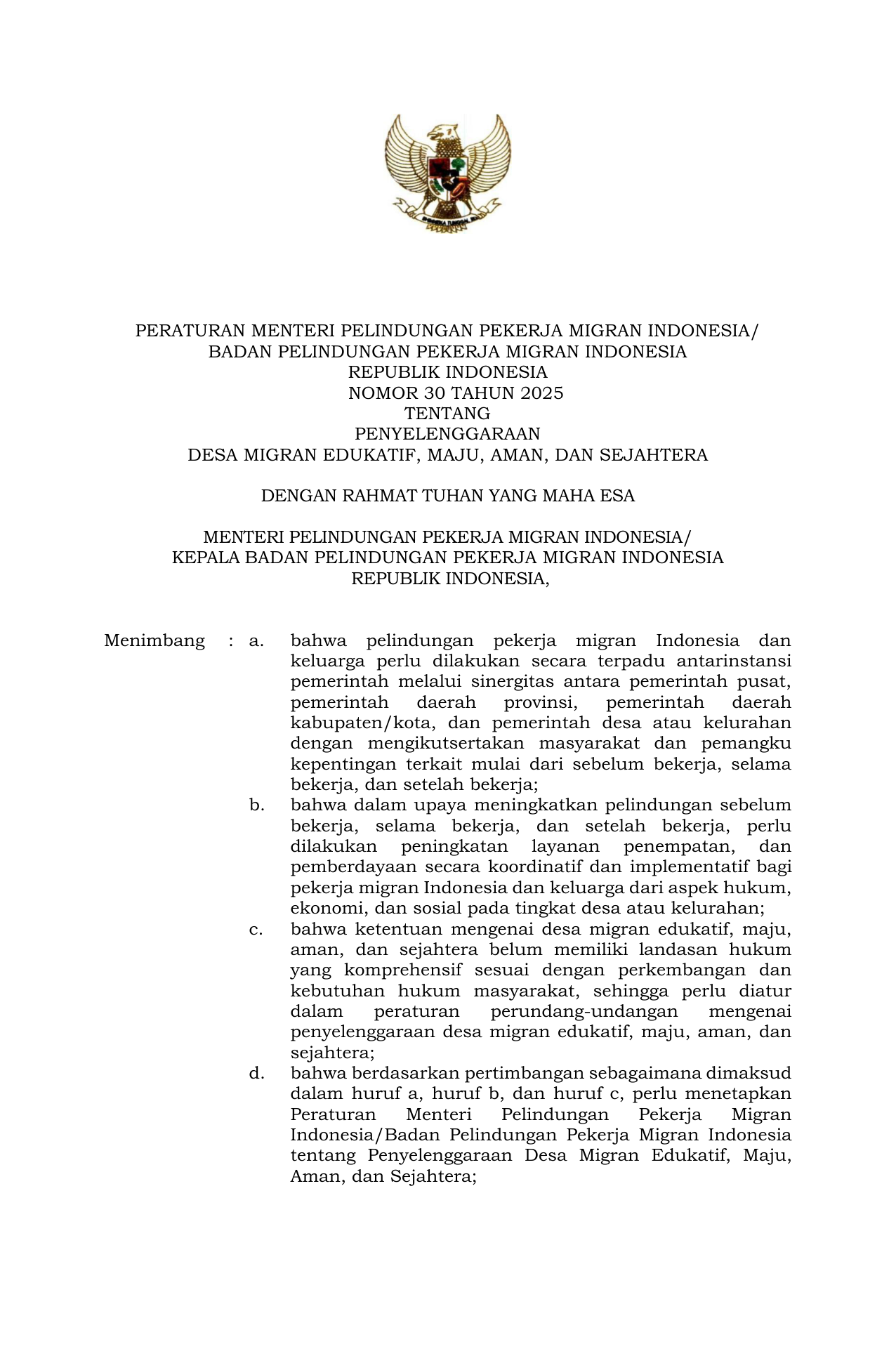 PERMEN Nomor 30 Tahun 2025 | Peraturan Menteri Nomor 30 Tahun 2025 tentang Penyelenggaraan Desa Migran Edukatif Maju Aman dan Sejahtera