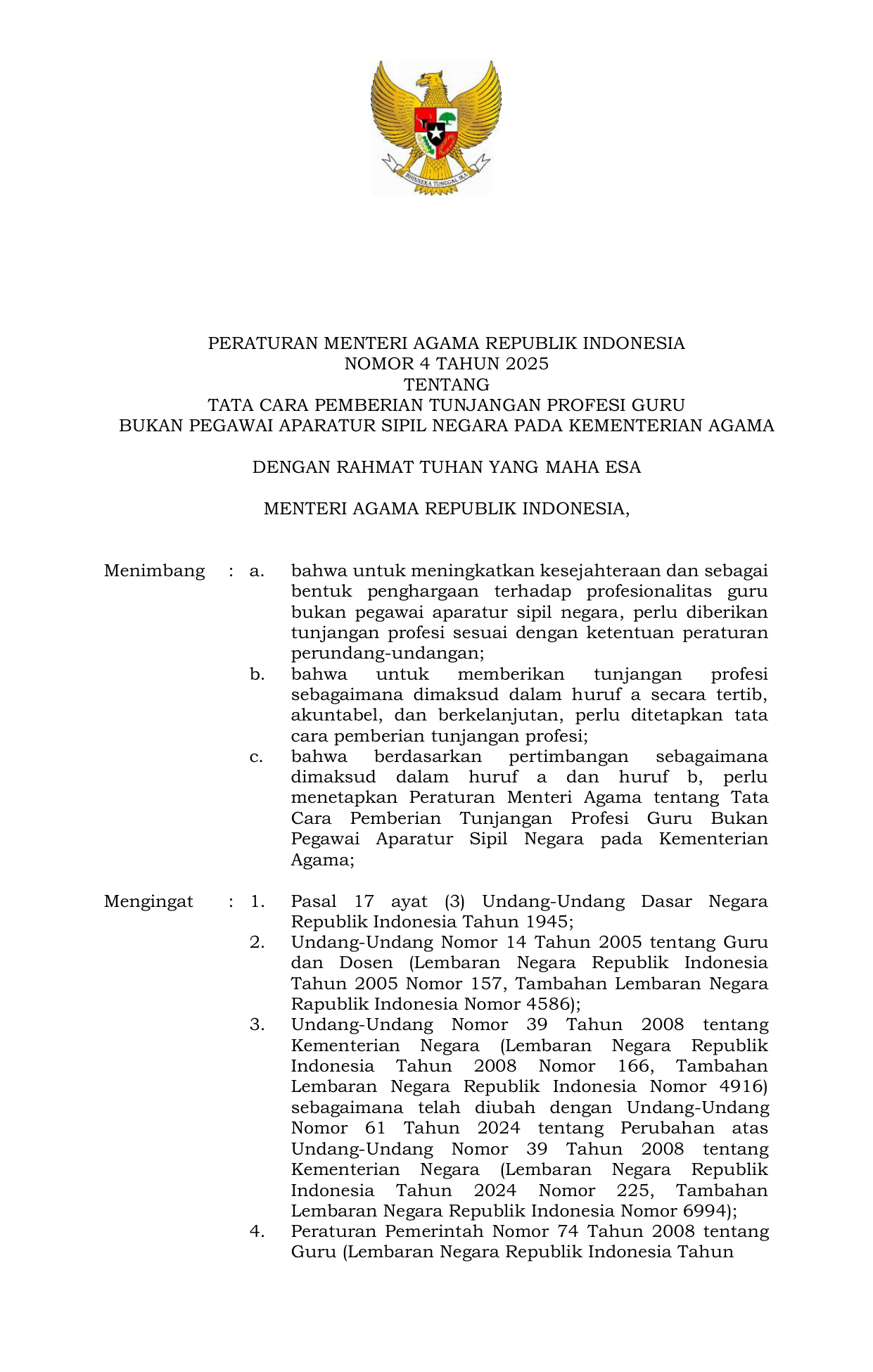 PERMEN Nomor 4 Tahun 2025 | Peraturan Menteri Nomor 4 Tahun 2025 tentang Tata Cara Pembayaran Tunjangan Profesi Guru Bukan Pegawai Aparatur Sipil Negara pada Kementerian Agama