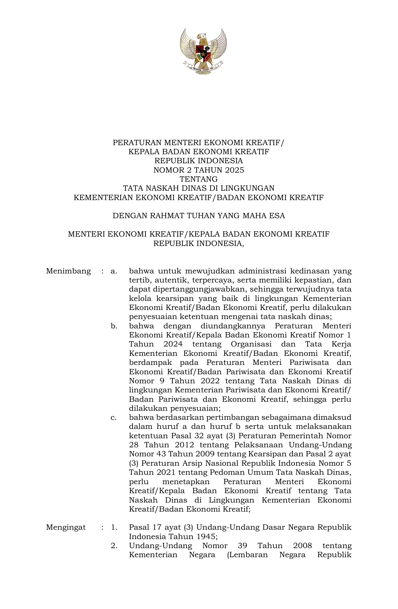 PERMEN Nomor 2 Tahun 2025 | Peraturan Menteri Nomor 2 Tahun 2025 tentang Tata Naskah Dinas di Lingkungan Kementerian Ekonomi Kreatif Badan Ekonomi Kreatif