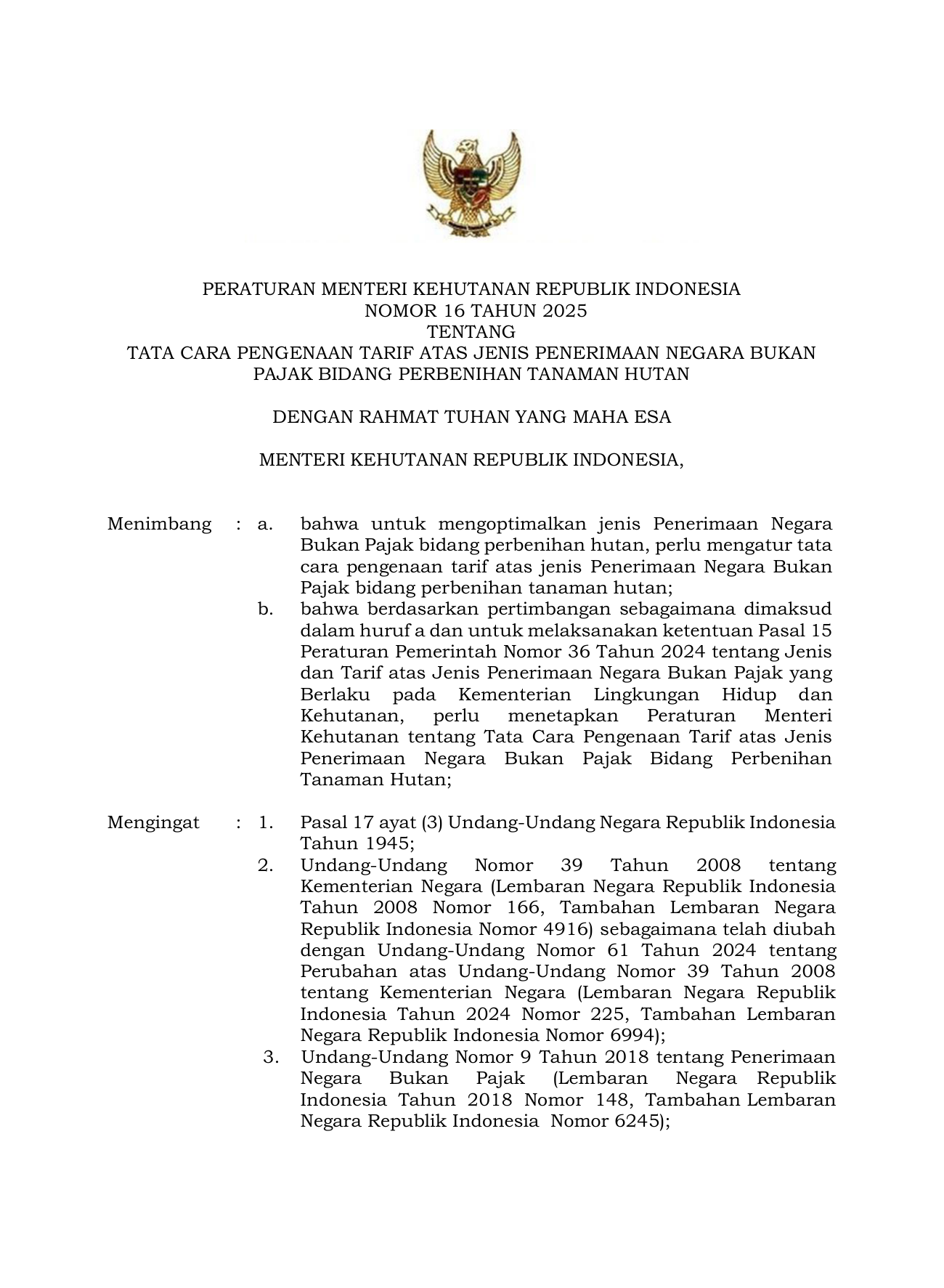 PERMEN Nomor 16 Tahun 2025 | Peraturan Menteri Nomor 16 Tahun 2025 tentang TATA CARA PENGENAAN TARIF ATAS JENIS PENERIMAAN NEGARA BUKAN PAJAK BIDANG PERBENIHAN TANAMAN HUTAN