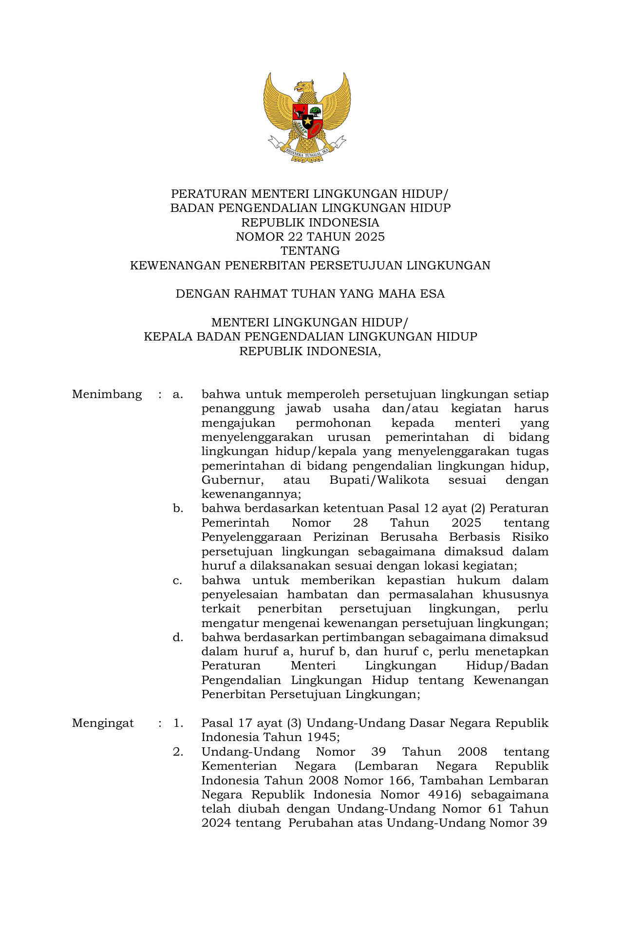 PERMEN Nomor 22 Tahun 2025 | Peraturan Menteri Nomor 22 Tahun 2025 tentang Kewenangan Penerbitan Persetujuan Lingkungan