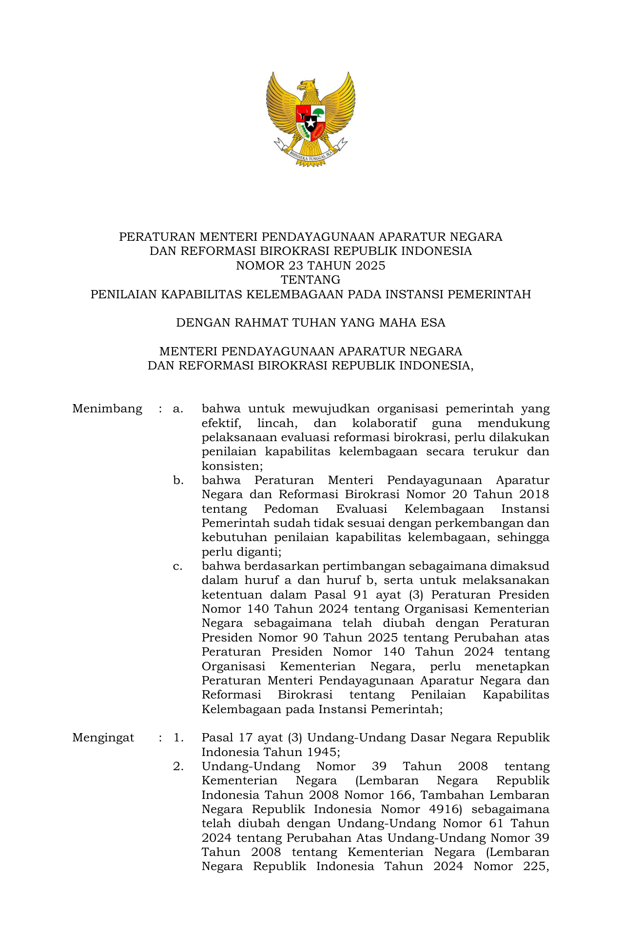 PERMEN Nomor 23 Tahun 2025 | Peraturan Menteri Nomor 23 Tahun 2025 tentang Penilaian Kapabilitas Kelembagaan pada Instansi Pemerintah