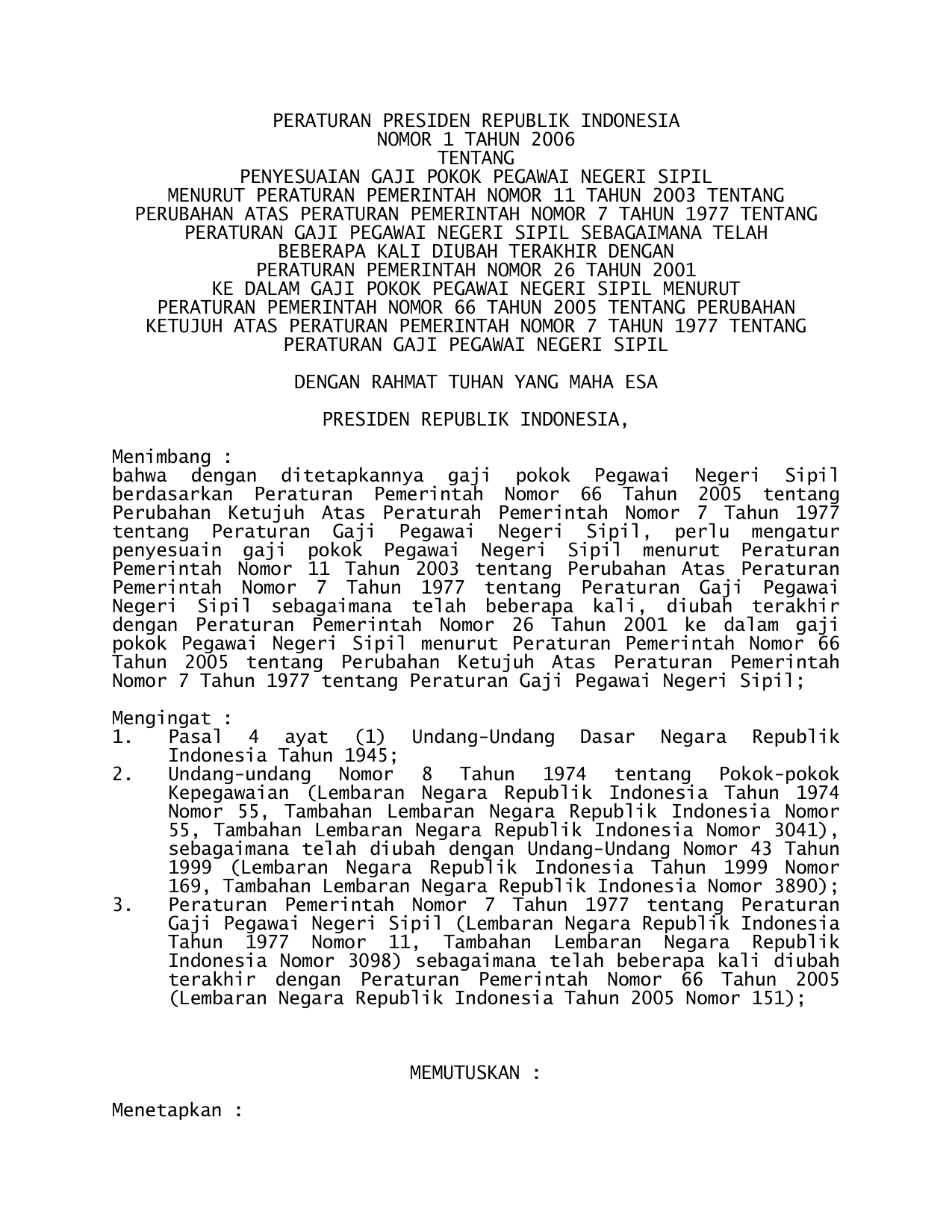 PERPRES Nomor 1 Tahun 2006 | Peraturan Presiden Nomor 1 Tahun 2006 tentang PENYESUAIAN GAJI POKOK PEGAWAI NEGERI SIPIL MENURUT PP 11-2003 TENTANG PERUBAHAN PP 7-1977 TENTANG PERATURAN GAJI PEGAWAI NEGERI SIPIL SEBAGAIMANA TELAH BEBERAPA KALI DIUBAH TERAKHIR DENGAN PP 26-2001 KE DALAM GAJI POKOK PEGAWAI NEGERI SIPIL MENURUT PP 66-2005 TENTANG PERUBAHAN KETUJUH PP 7-1977 TENTANG PERATURAN GAJI PEGAWAI NEGERI SIPIL
