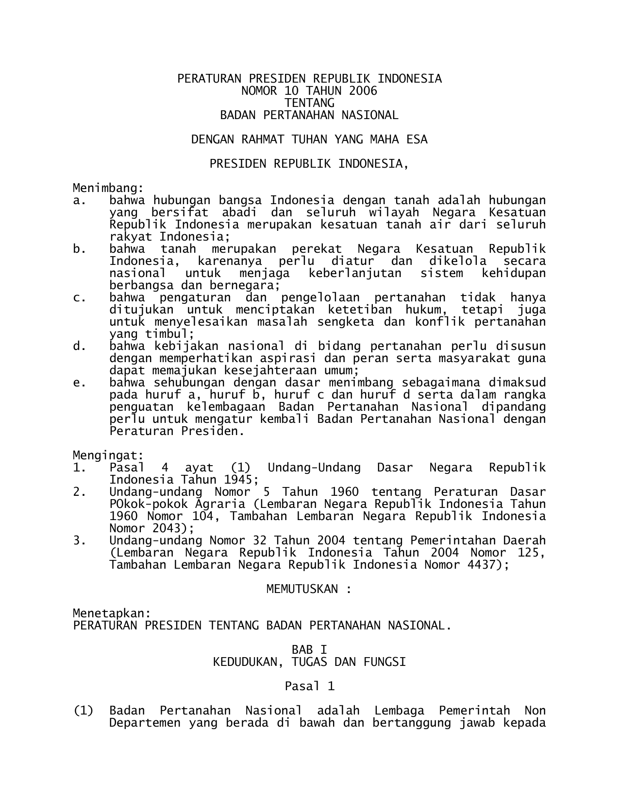 PERPRES Nomor 10 Tahun 2006 | Peraturan Presiden Nomor 10 Tahun 2006 tentang BADAN PERTANAHAN NASIONAL
