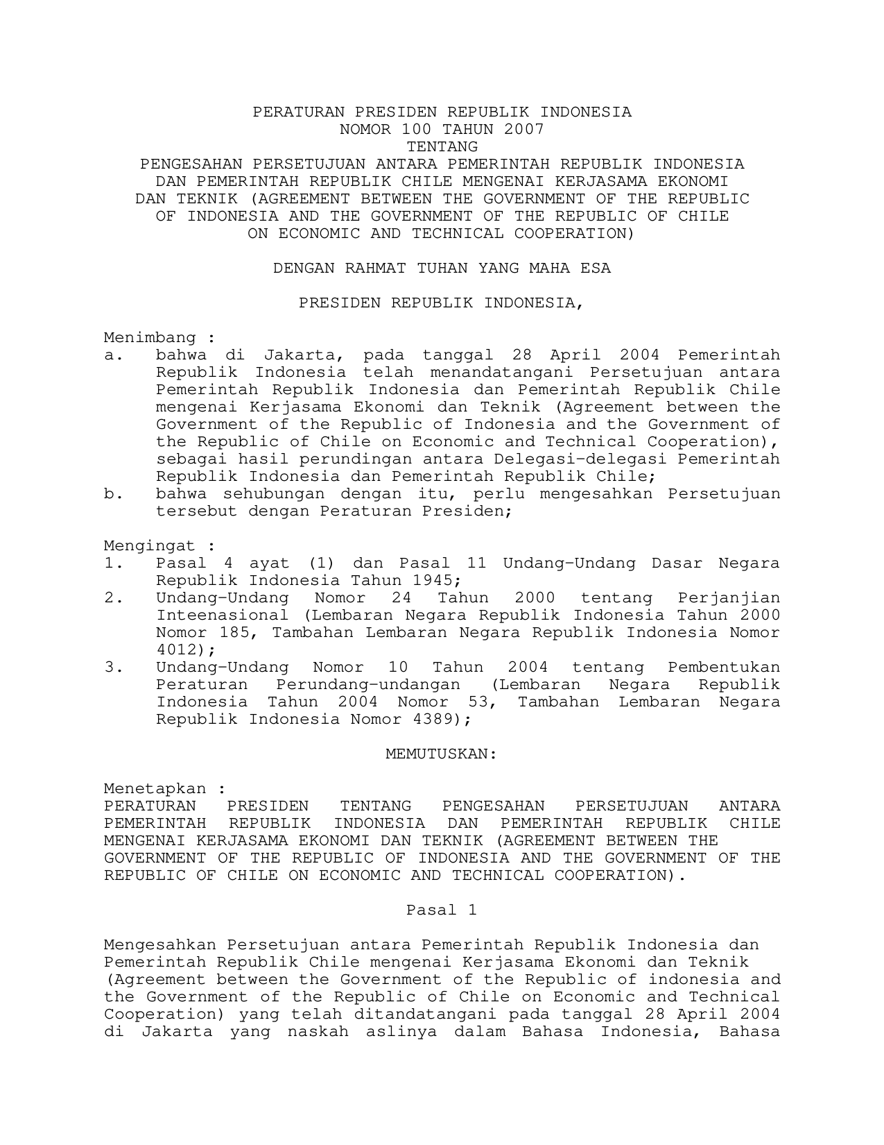 PERPRES Nomor 100 Tahun 2007 | Peraturan Presiden Nomor 100 Tahun 2007 tentang PENGESAHAN PERSETUJUAN ANTARA PEMERINTAH RI DAN PEMERINTAH REPUBLIK CHILE MENGENAI KERJASAMA EKONOMI DAN TEKNIK (AGRREMENT BETWEEN THE GOVERNMENT OF THE REPUBLIC OF INDONESIA AND THE GOVERNMENT OF THE TREPUBLIC OF CHILE ON ECONOMIC AND TECHNICAL COOPERATION)