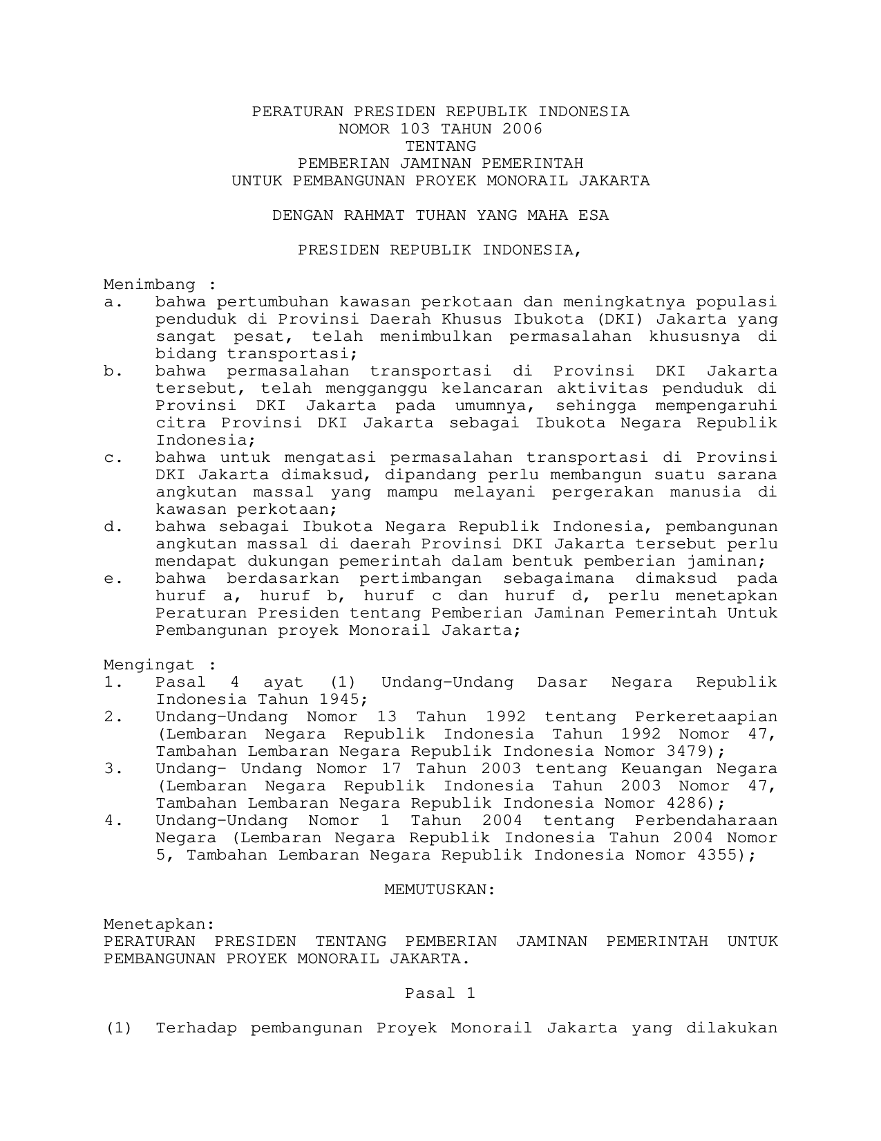 PERPRES Nomor 103 Tahun 2006 | Peraturan Presiden Nomor 103 Tahun 2006 tentang PEMBERIAN JAMINAN PEMERINTAH UNTUK PEMBANGUNAN PROYEK MONORAIL JAKARTA