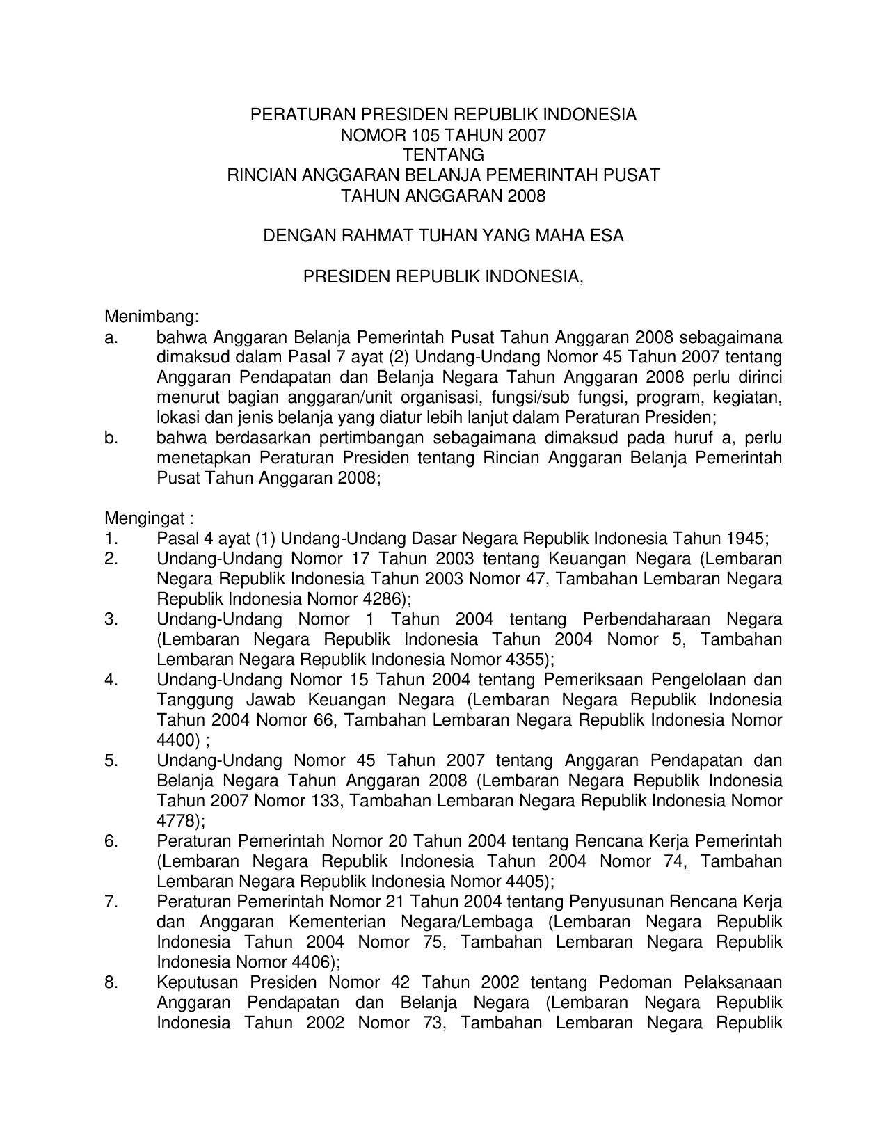 PERPRES Nomor 105 Tahun 2007 | Peraturan Presiden Nomor 105 Tahun 2007 tentang RINCIAN ANGGARAN BELANJA PEMERINTAH PUSAT TAHUN ANGGARAN 2008