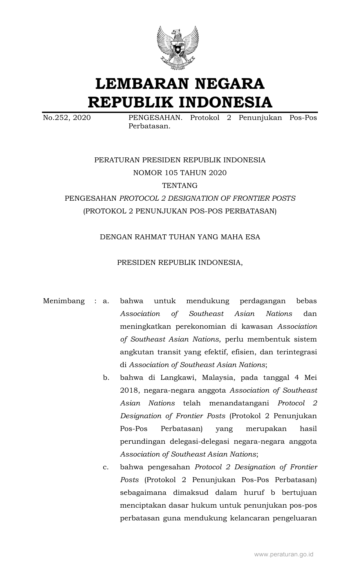 PERPRES Nomor 105 Tahun 2020 | Peraturan Presiden Nomor 105 Tahun 2020 tentang PENGESAHAN PROTOCOL 2 DESIGNATION OF FRONTIER POSTS (PROTOKOL 2 PENUNJUKAN POS-POS PERBATASAN)
