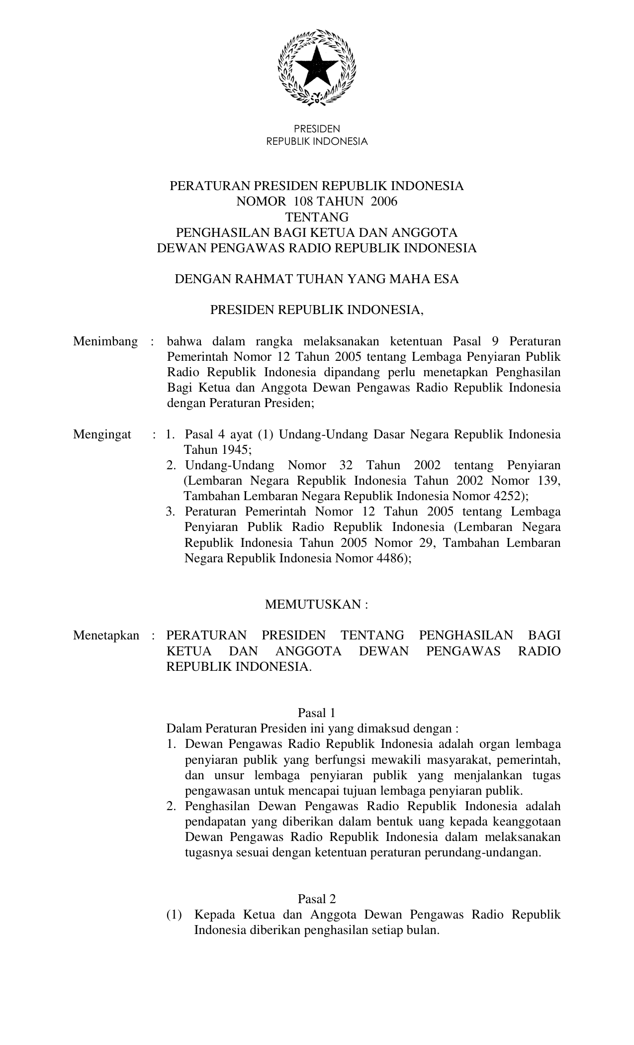 PERPRES Nomor 108 Tahun 2006 | Peraturan Presiden Nomor 108 Tahun 2006 tentang PENGHASILAN BAGI KETUA DAN ANGGOTA DEWAN PENGAWAS RADIO REPUBLIK INDONESIA