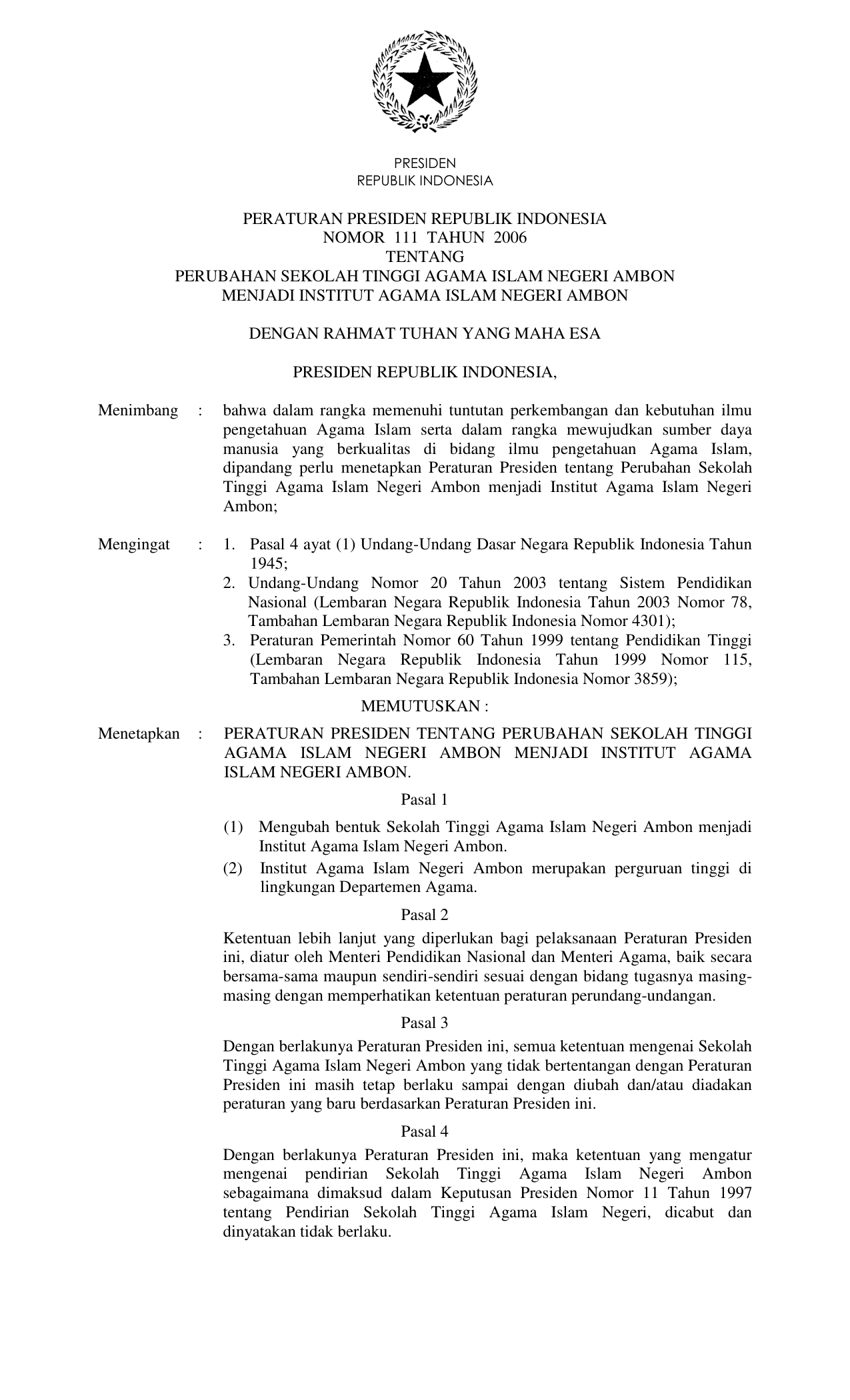 PERPRES Nomor 111 Tahun 2006 | Peraturan Presiden Nomor 111 Tahun 2006 tentang PERUBAHAN SEKOLAH TINGGI AGAMA ISLAM NEGERI AMBON MENJADI INSTITUT AGAMA ISLAM AMBON