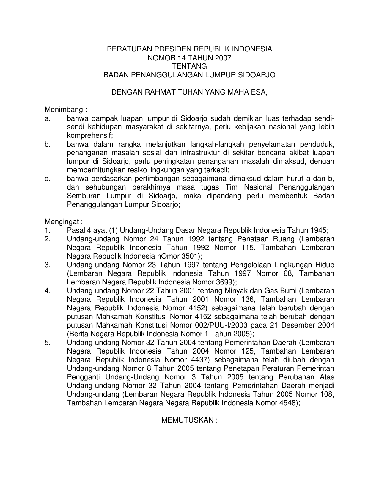 PERPRES Nomor 14 Tahun 2007 | Peraturan Presiden Nomor 14 Tahun 2007 tentang BADAN PENANGGULANGAN LUMPUR SIDOARJO