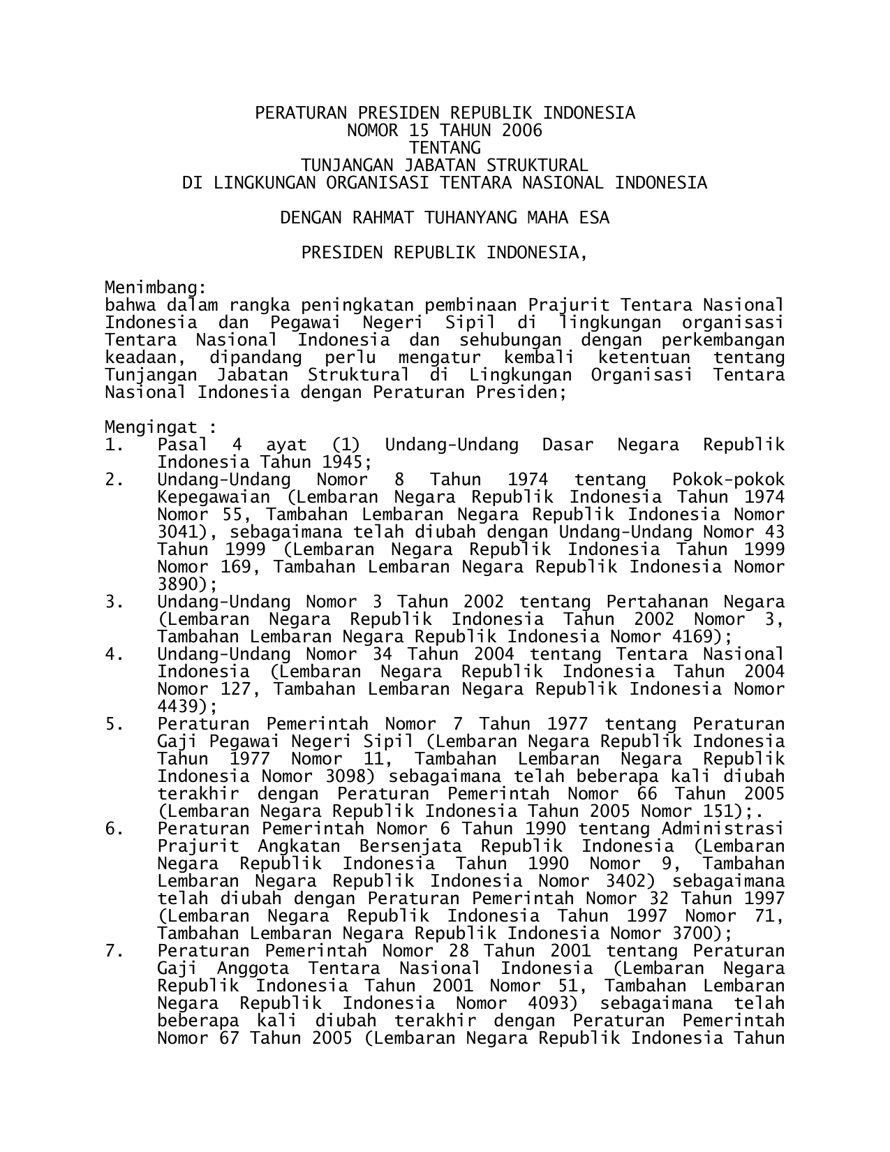 PERPRES Nomor 15 Tahun 2006 | Peraturan Presiden Nomor 15 Tahun 2006 tentang TUNJANGAN JABATAN STRUKTURAL DI LINGKUNGAN ORGANISASI TENTARA NASIONAL INDONESIA