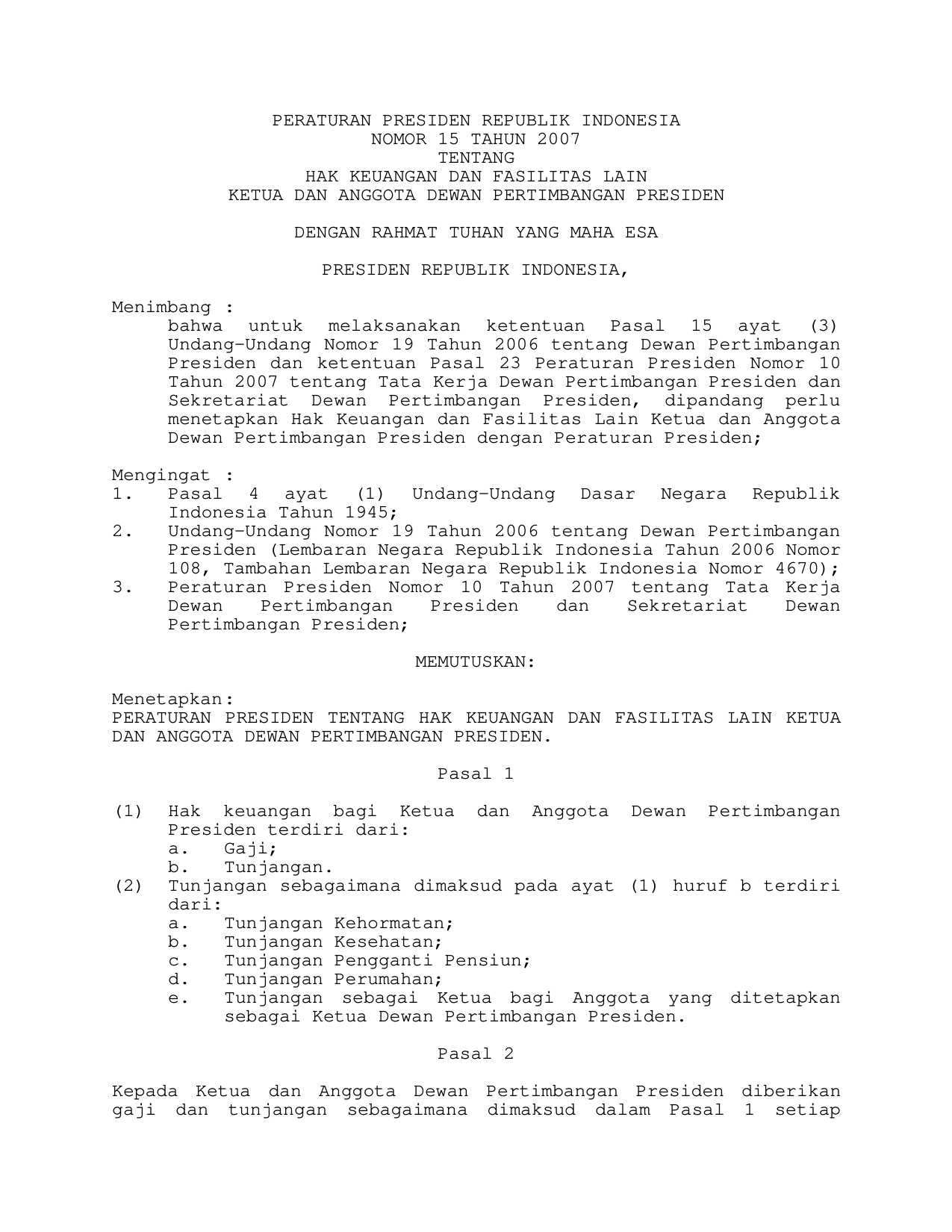 PERPRES Nomor 15 Tahun 2007 | Peraturan Presiden Nomor 15 Tahun 2007 tentang HAK KEUANGAN DAN FASILITAS LAIN KETUA DAN ANGGOTA DEWAN PERTIMBANGAN PRESIDEN