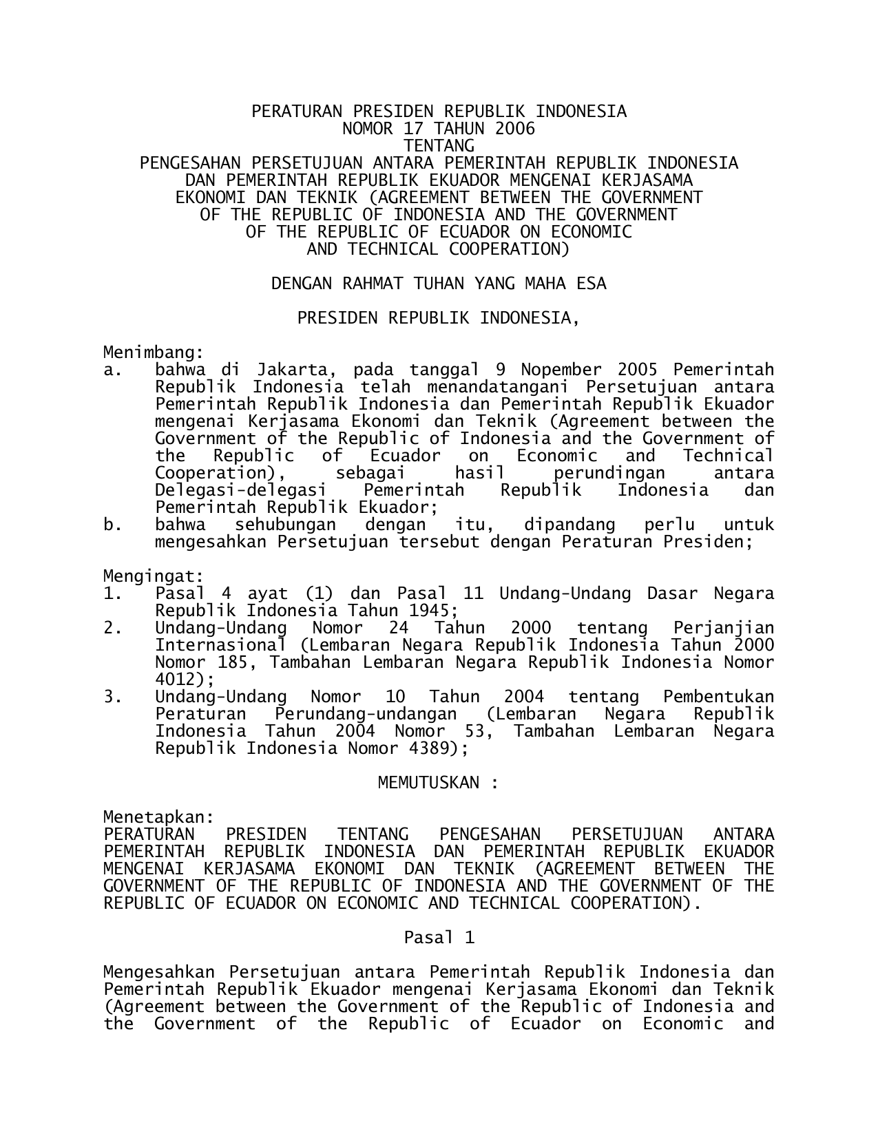 PERPRES Nomor 17 Tahun 2006 | Peraturan Presiden Nomor 17 Tahun 2006 tentang PENGESAHAN PERSETUJUAN ANTARA PEMERINTAH RI DAN PEMERINTAH REPUBLIK EKUADOR MENGENAI KERJASAMA EKONOMI DAN TEKNIK (AGREEMENT BETWEEN THE GOVERNMENT OF THE REPUBLIC OF INDONESIA AND THE GOVERNMENT OF THE REPUBLIC OF ECUADOR ON ECONOMIC AND TECHNICAL CO0PERATION)