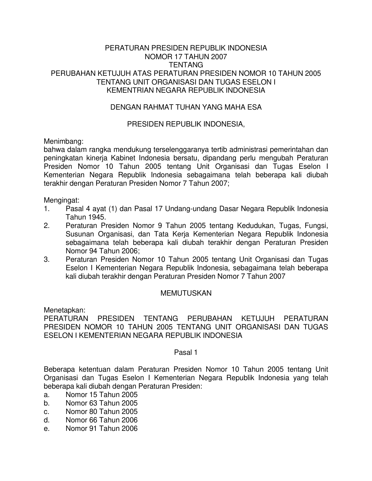 PERPRES Nomor 17 Tahun 2007 | Peraturan Presiden Nomor 17 Tahun 2007 tentang PERUBAHAN KETUJUH PERPRES 10-2005 TENTANG UNIT ORGANISASI DAN TUGAS ESELON I KEMENTERIAN NEGARA RI