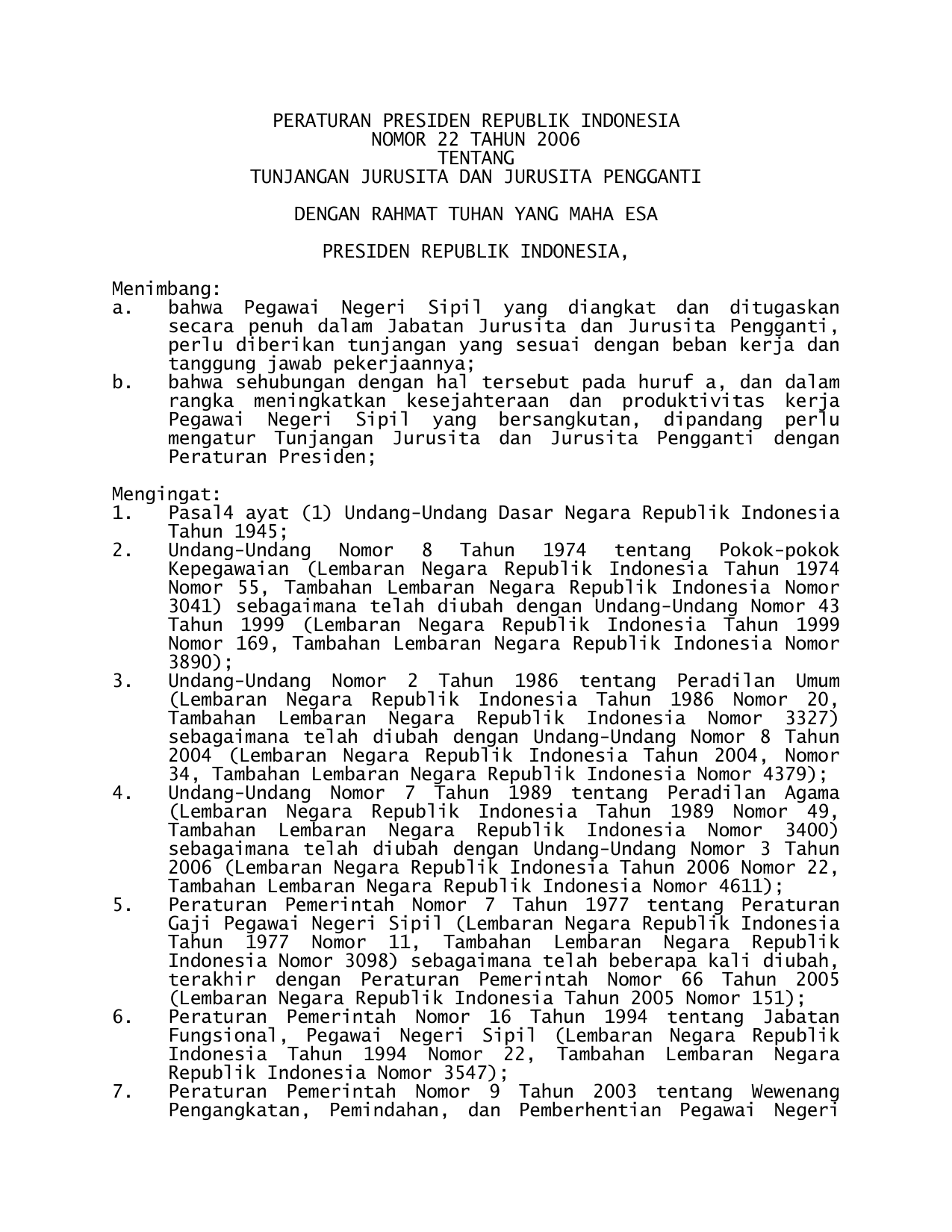 PERPRES Nomor 22 Tahun 2006 | Peraturan Presiden Nomor 22 Tahun 2006 tentang TUNJANGAN JURUSITA DAN JURUSITA PENGGANTI