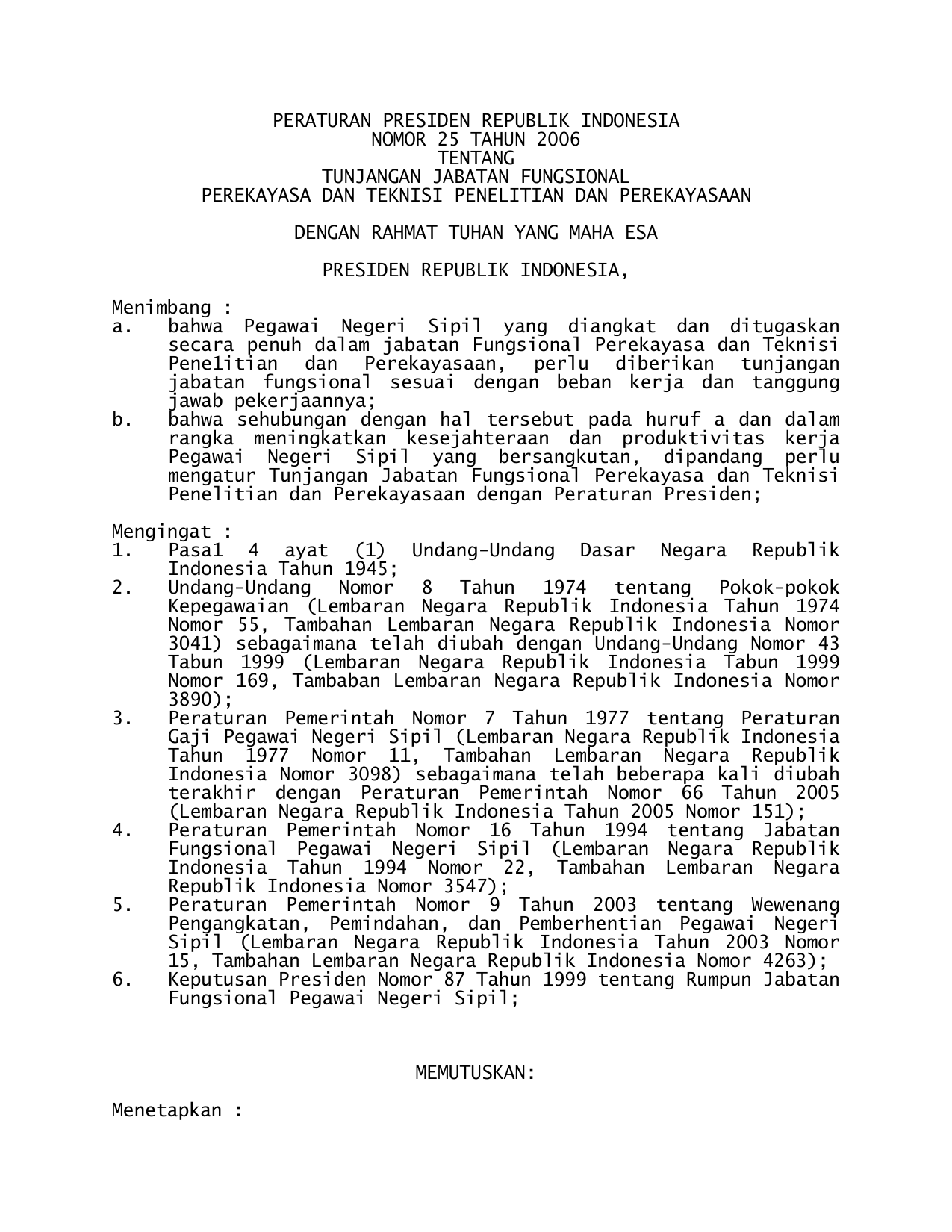 PERPRES Nomor 25 Tahun 2006 | Peraturan Presiden Nomor 25 Tahun 2006 tentang TUNJANGAN JABATAN FUNGSIONAL PEREKAYASA DAN TEKNISI PENELITIAN DAN PEREKAYASAAN