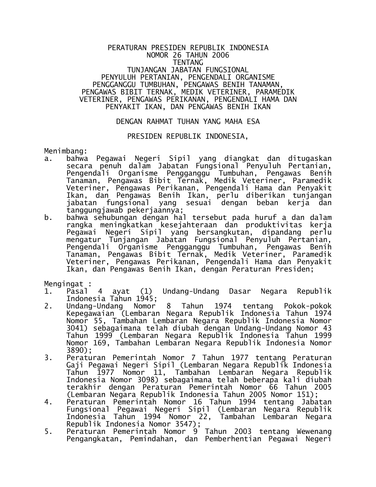 PERPRES Nomor 26 Tahun 2006 | Peraturan Presiden Nomor 26 Tahun 2006 tentang TUNJANGAN JABATAN FUNGSIONAL PENYULUH PERTANIAN, PENGENDALI ORGANISME PENGGANGGU TUMBUHAN, PENGAWAS BENIH TANAMAN, PENGAWAS BIBIT TERNAK, MEDIK VETERINER, PARAMEDIK VETERINER, PENGAWAS PERIKANAN, PENGENDALI HAMA DAN PENYAKIT IKAN, DAN PENGAWAS BENIH IKAN