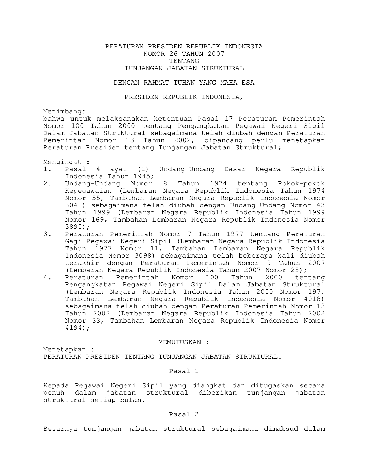 PERPRES Nomor 26 Tahun 2007 | Peraturan Presiden Nomor 26 Tahun 2007 tentang TUNJANGAN JABATAN STRUKTURAL
