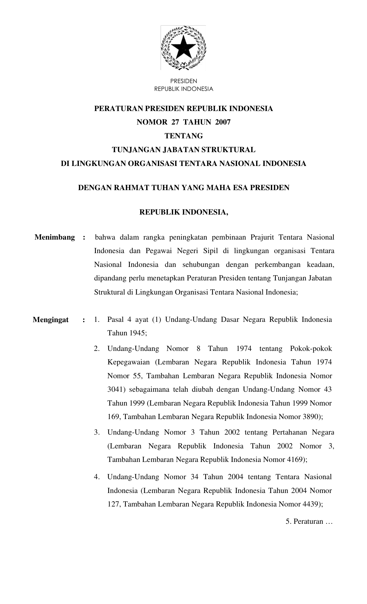 PERPRES Nomor 27 Tahun 2007 | Peraturan Presiden Nomor 27 Tahun 2007 tentang TUNJANGAN JABATAN STRUKTURAL DI LINGKUNGAN ORGANISASI TENTARA NASIONAL INDONESIA