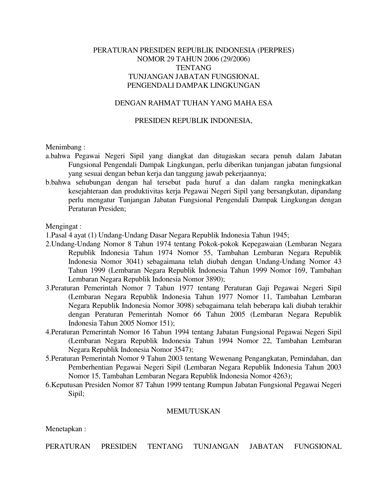 PERPRES Nomor 29 Tahun 2006 | Peraturan Presiden Nomor 29 Tahun 2006 tentang TUNJANGAN JABATAN FUNGSIONAL PENGENDALI DAMPAK LINGKUNGAN