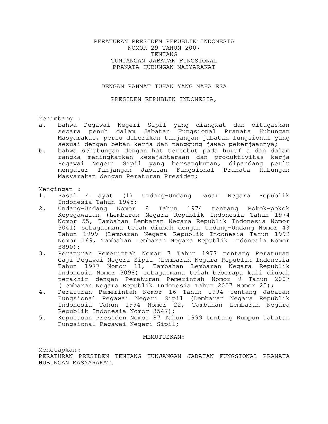 PERPRES Nomor 29 Tahun 2007 | Peraturan Presiden Nomor 29 Tahun 2007 tentang TUNJANGAN JABATAN FUNGSIONAL PRANATA HUBUNGAN MASYARAKAT