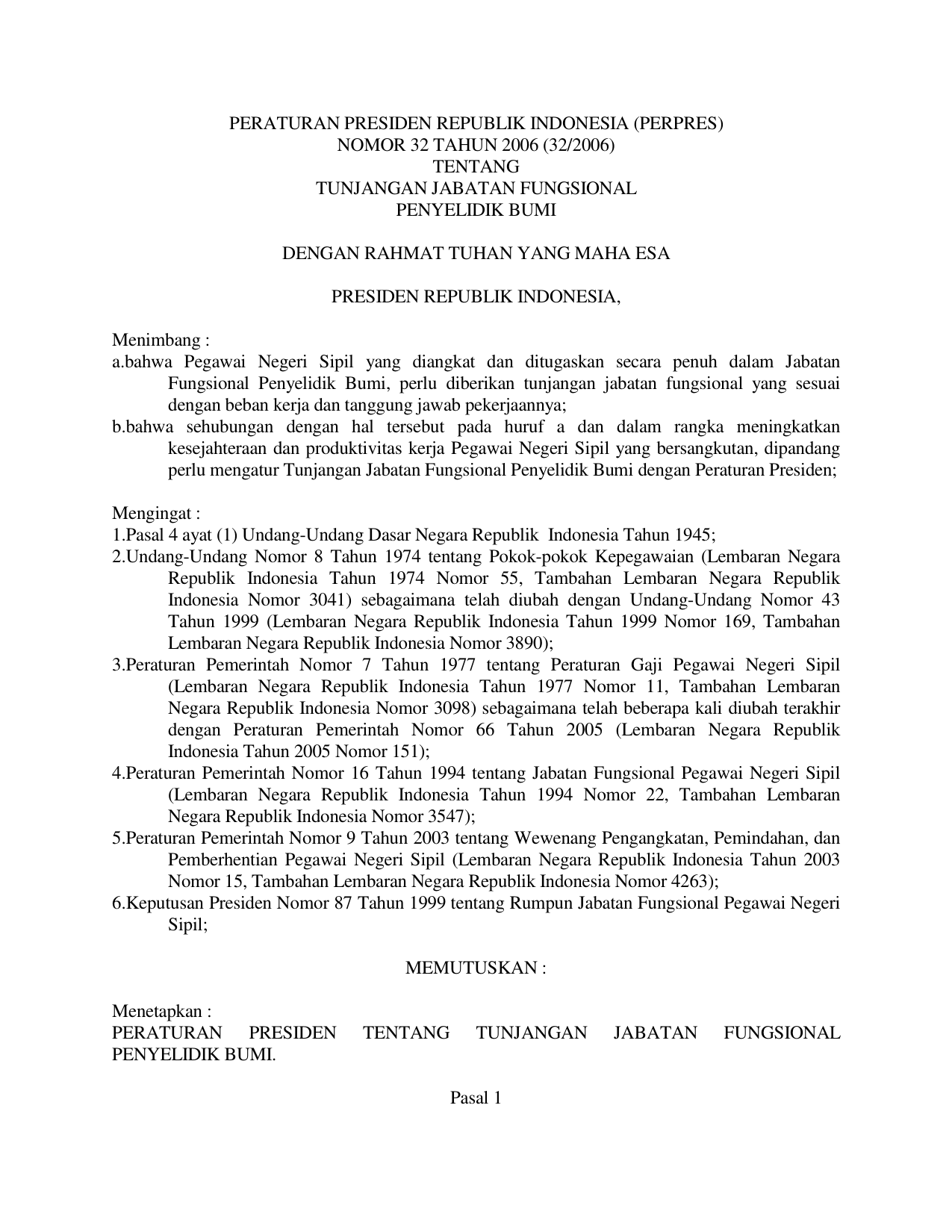 PERPRES Nomor 32 Tahun 2006 | Peraturan Presiden Nomor 32 Tahun 2006 tentang TUNJANGAN JABATAN FUNGSIONAL PENYELIDIK BUMI