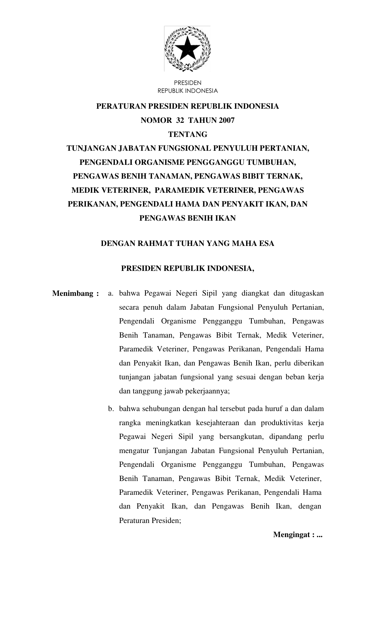 PERPRES Nomor 32 Tahun 2007 | Peraturan Presiden Nomor 32 Tahun 2007 tentang TUNJANGAN JABATAN FUNGSIONAL PENYULUH PERTANIAN, PENGENDALI ORGANISME PENGGANGGU TUMBUHAN, PENGAWAS BENIH TANAMAN, PENGAWAS BIBIT TERNAK, MEDIK VETERINER, PARAMEDIK VETERINER, PENGAWAS PERIKANAN, PENGENDALI HAMA DAN PENYAKIT IKAN, DAN PENGAWAS BENIH IKAN