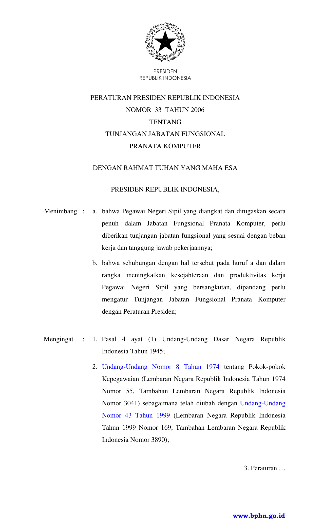 PERPRES Nomor 33 Tahun 2006 | Peraturan Presiden Nomor 33 Tahun 2006 tentang TUNJANGAN JABATAN FUNGSIONAL PRANATA KOMPUTER