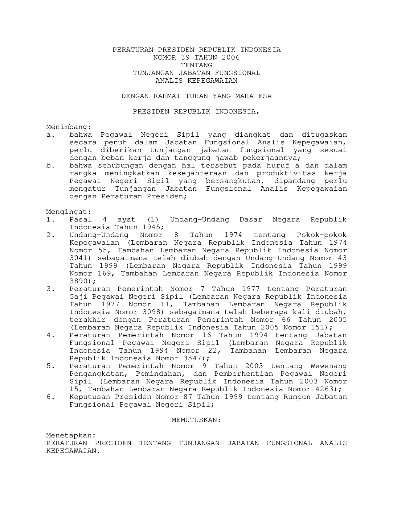 PERPRES Nomor 39 Tahun 2006 | Peraturan Presiden Nomor 39 Tahun 2006 tentang TUNJANGAN JABATAN FUNGSIONAL ANALIS KEPEGAWAIAN
