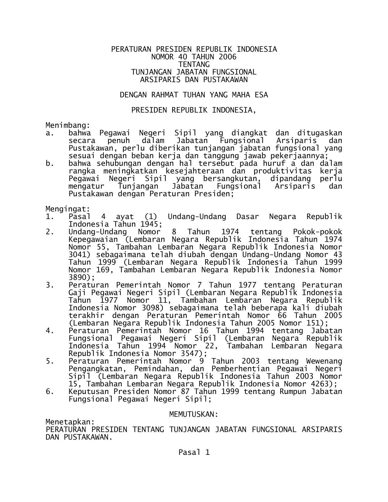 PERPRES Nomor 40 Tahun 2006 | Peraturan Presiden Nomor 40 Tahun 2006 tentang TUNJANGAN JABATAN FUNGSIONAL ARSIPARIS DAN PUSTAKAWAN
