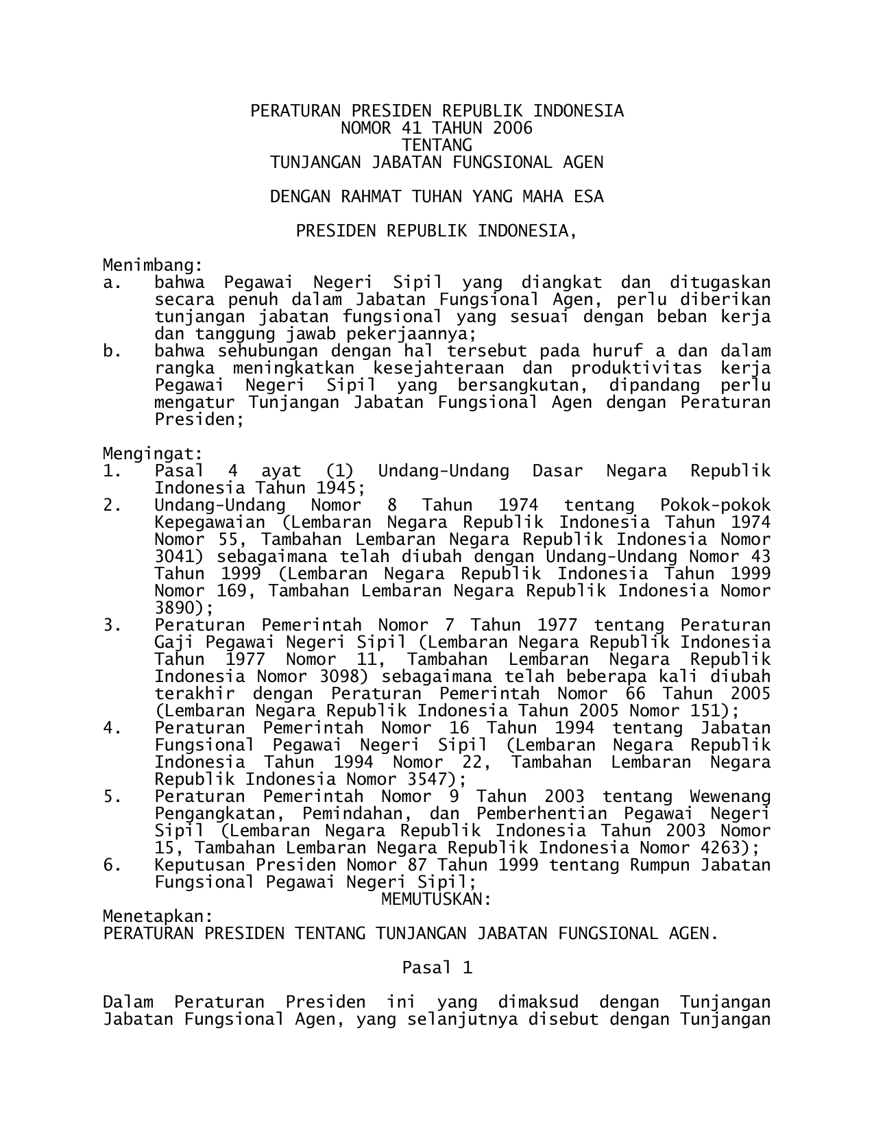 PERPRES Nomor 41 Tahun 2006 | Peraturan Presiden Nomor 41 Tahun 2006 tentang TUNJANGAN JABATAN FUNGSIONAL AGEN