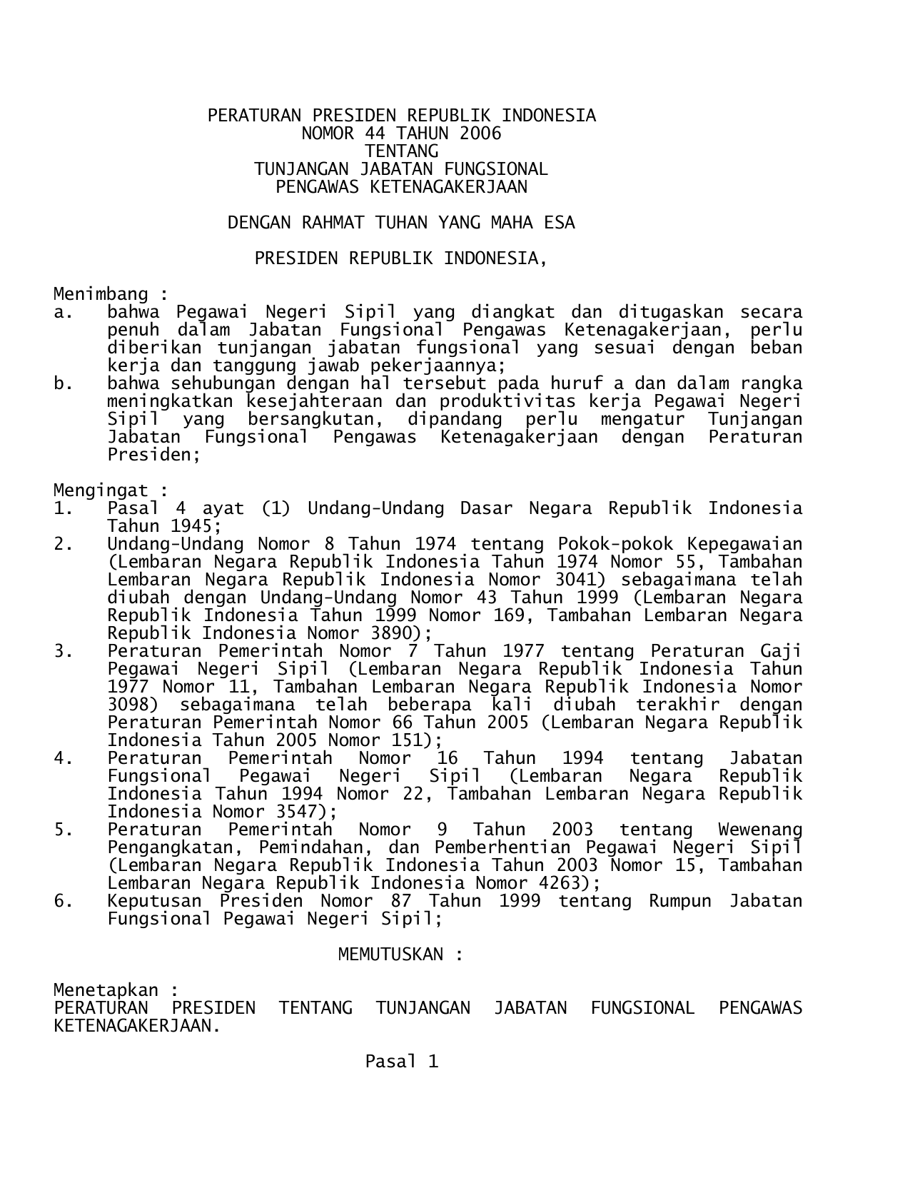 PERPRES Nomor 44 Tahun 2006 | Peraturan Presiden Nomor 44 Tahun 2006 tentang TUNJANGAN JABATAN FUNGSIONAL PENGAWAS KETENAGAKERJAAN