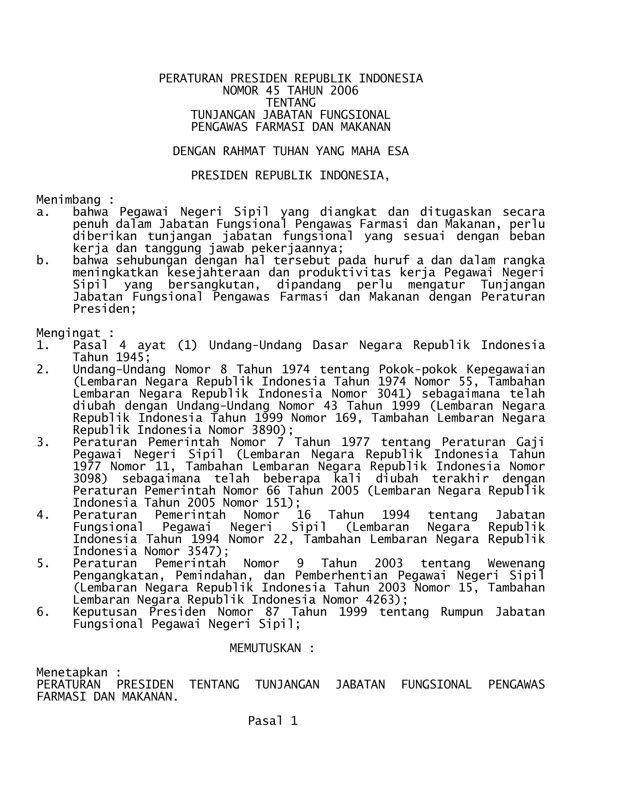 PERPRES Nomor 45 Tahun 2006 | Peraturan Presiden Nomor 45 Tahun 2006 tentang TUNJANGAN JABATAN FUNGSIONAL PENGAWAS FARMASI DAN MAKANAN