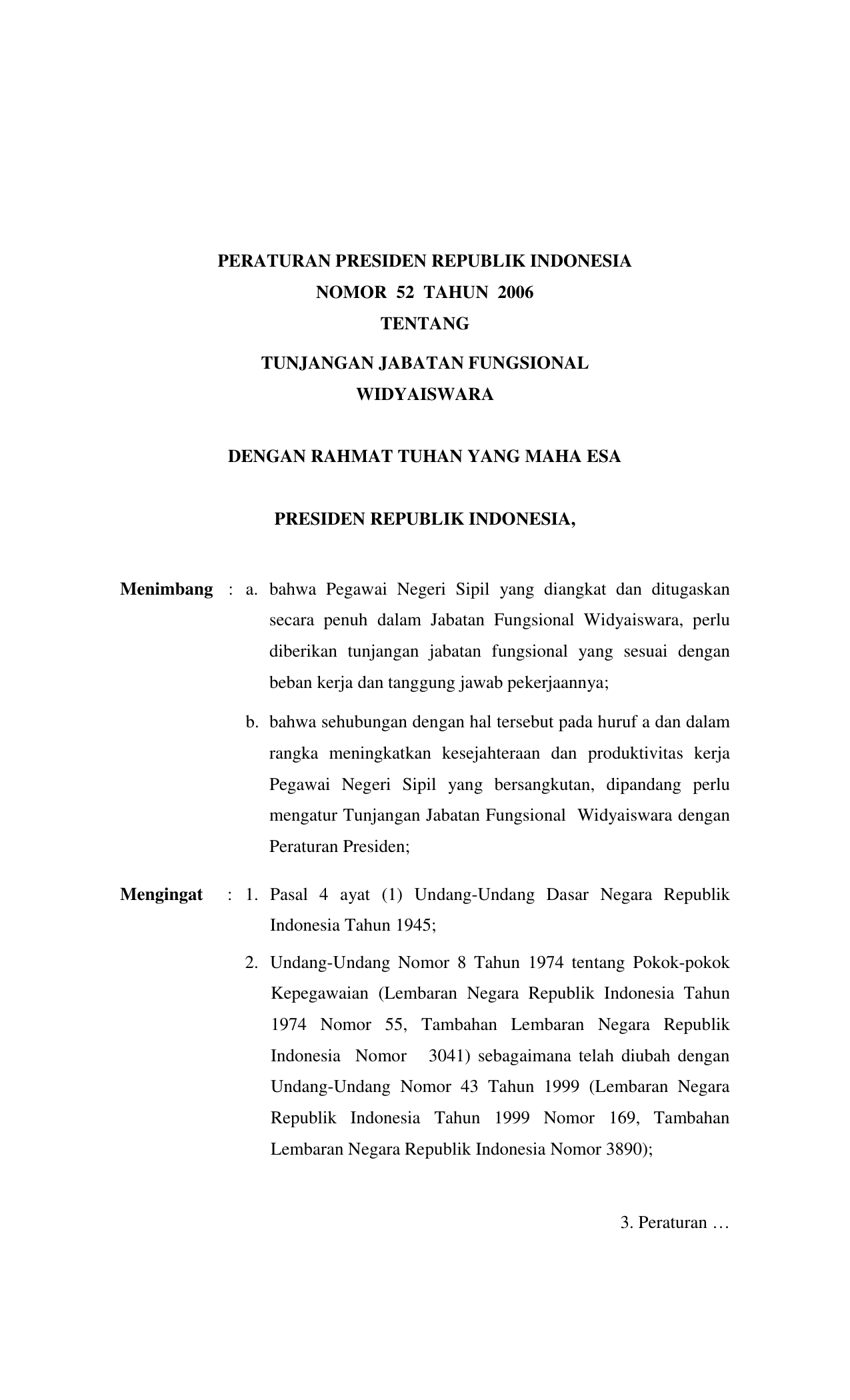 PERPRES Nomor 52 Tahun 2006 | Peraturan Presiden Nomor 52 Tahun 2006 tentang TUNJANGAN JABATAN FUNGSIONAL WIDYAISWARA