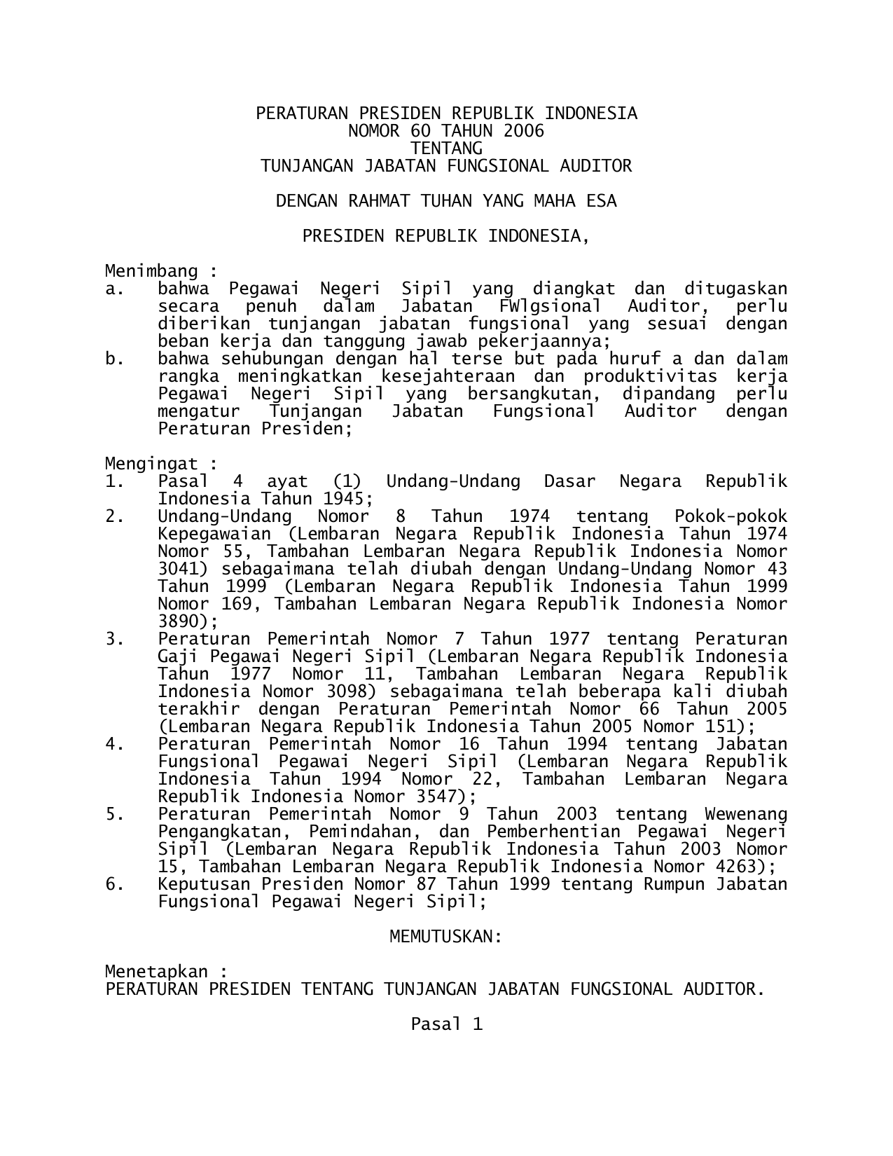 PERPRES Nomor 60 Tahun 2006 | Peraturan Presiden Nomor 60 Tahun 2006 tentang TUNJANGAN JABATAN FUNGSIONAL AUDITOR