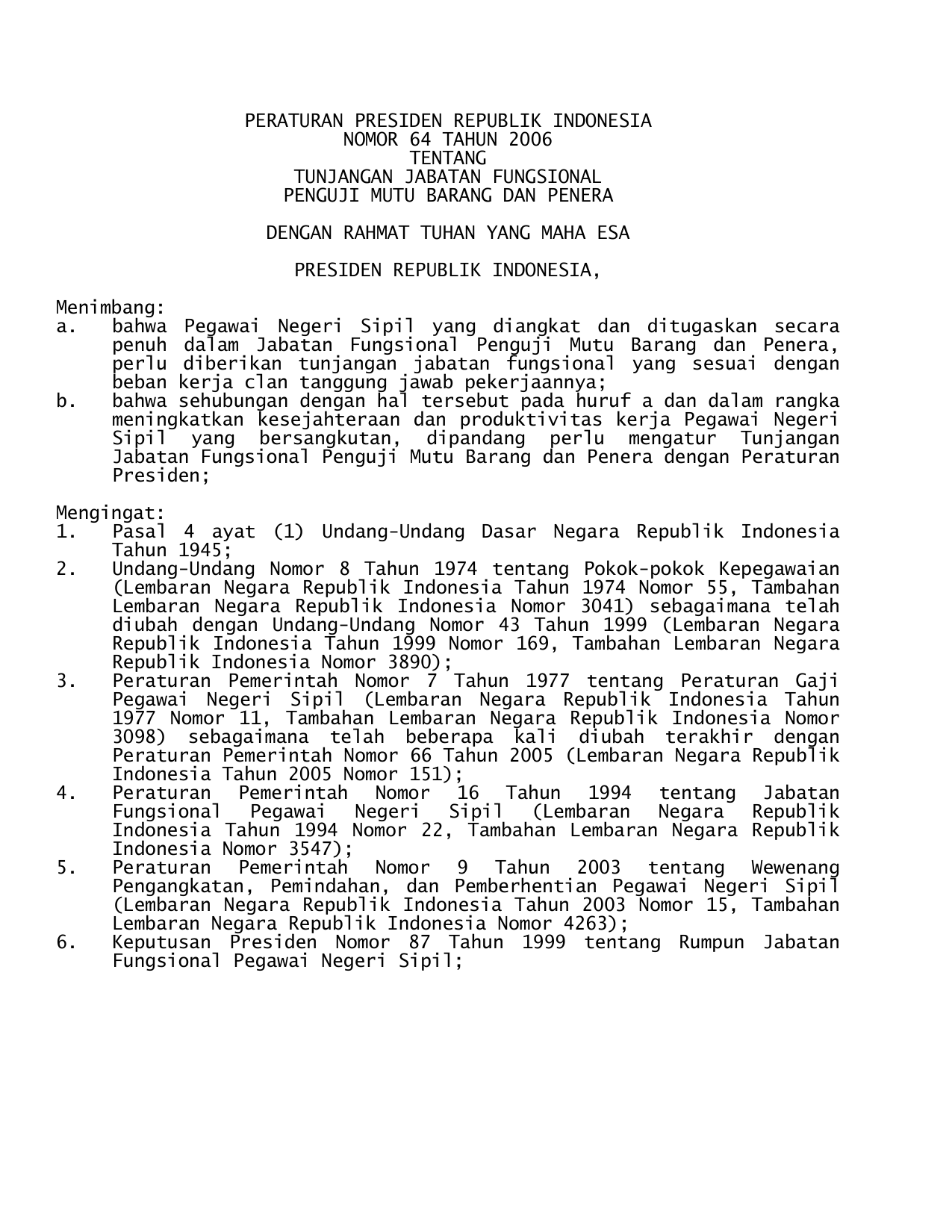 PERPRES Nomor 64 Tahun 2006 | Peraturan Presiden Nomor 64 Tahun 2006 tentang TUNJANGAN JABATAN FUNGSIONAL PENGUJI MUTU BARANG DAN PENERA