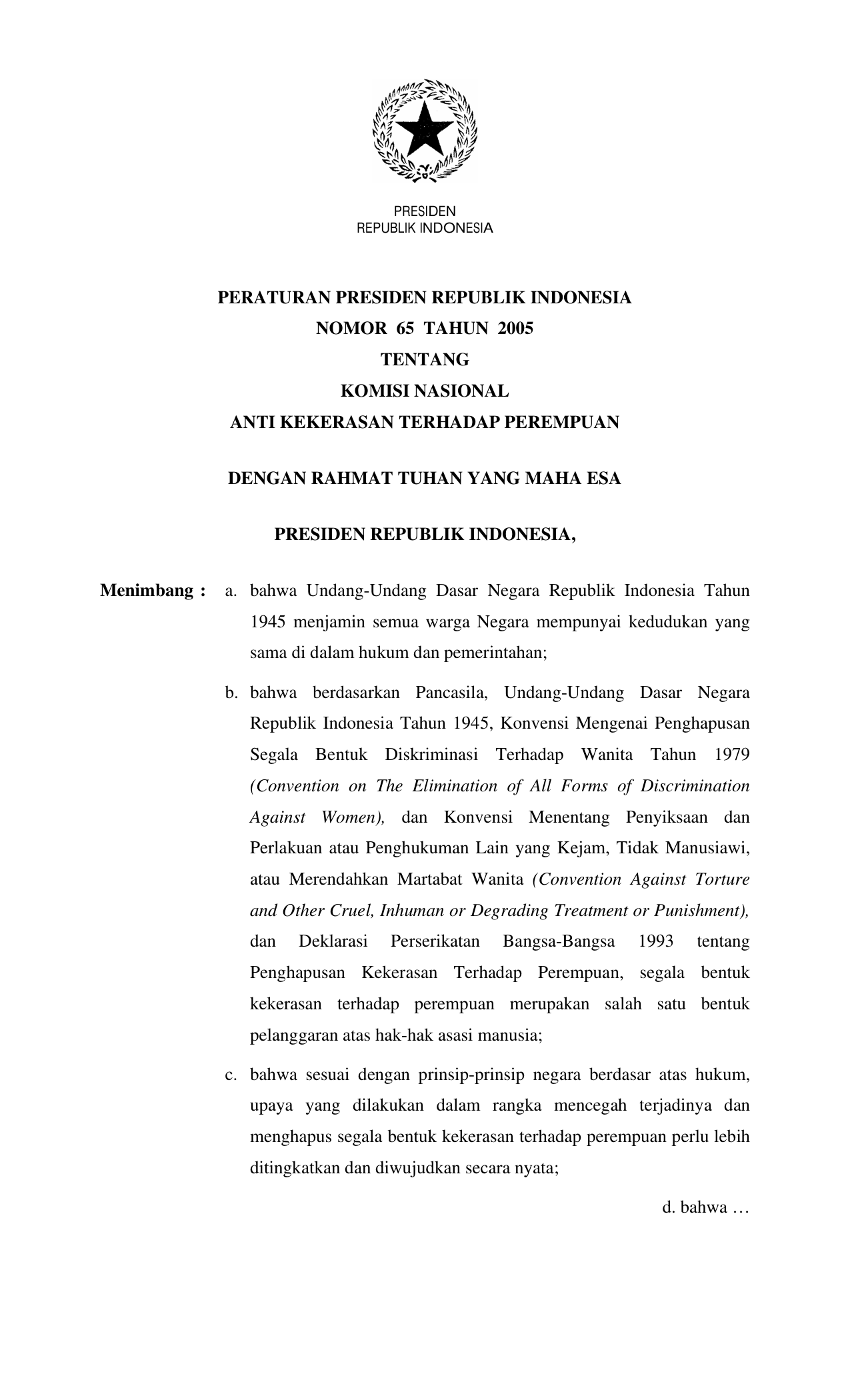 PERPRES Nomor 65 Tahun 2005 | Peraturan Presiden Nomor 65 Tahun 2005 tentang KOMISI NASIONAL ANTI KEKERASAN TERHADAP PEREMPUAN