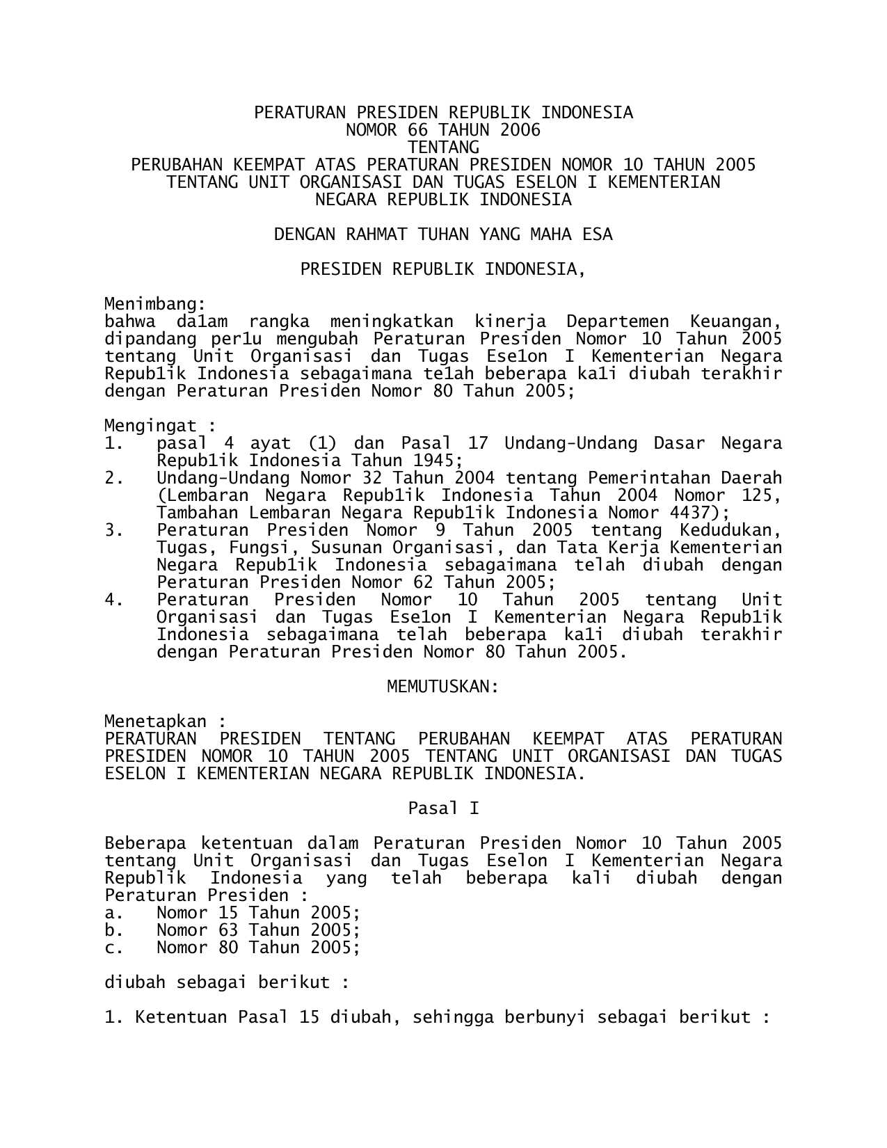 PERPRES Nomor 66 Tahun 2006 | Peraturan Presiden Nomor 66 Tahun 2006 tentang PERUBAHAN KEEMPAT PP 10-2005 TENTANG UNIT ORGANISASI DAN TUGAS ESELON I KEMENTERIAN NEGARA RI